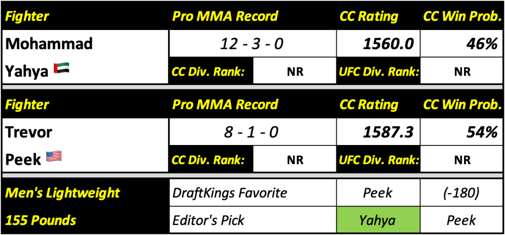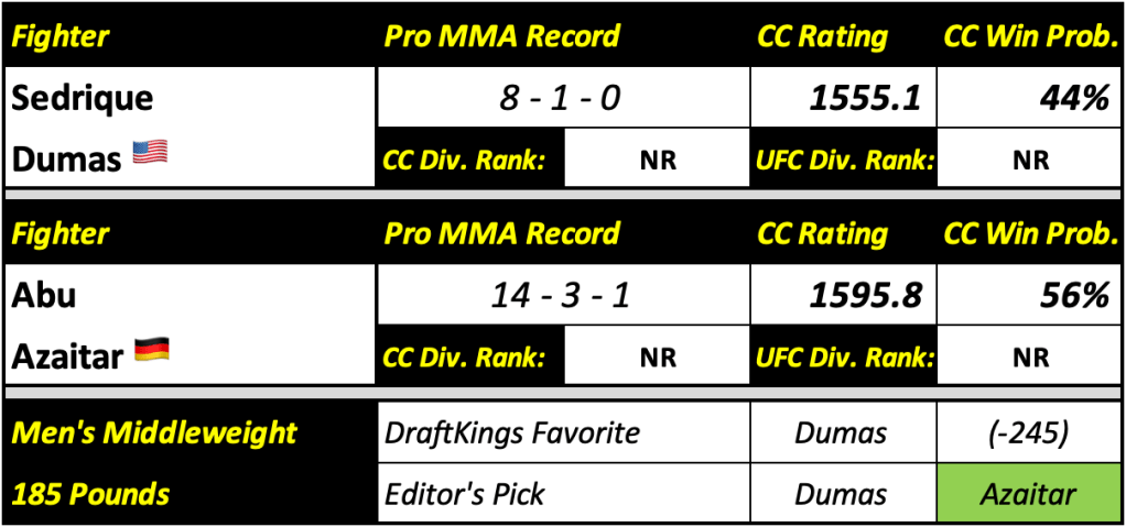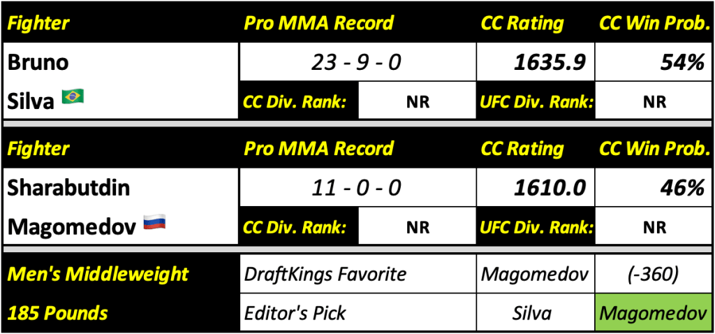 All win probabilities are based off of a fighter’s Cage Calculus (CC) Rating and their place in the CC Rankings. The fighter’s name highlighted in green at the bottom of the panel indicates the editor’s pick to win. Any number in brackets to the left of a fighter’s name indicates their ranking in the CC Rankings, not the official UFC Rankings.