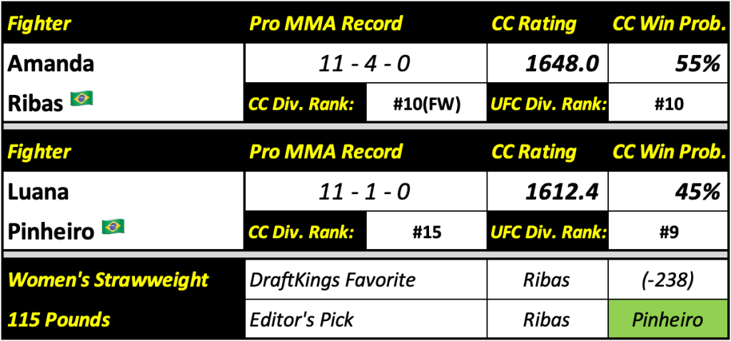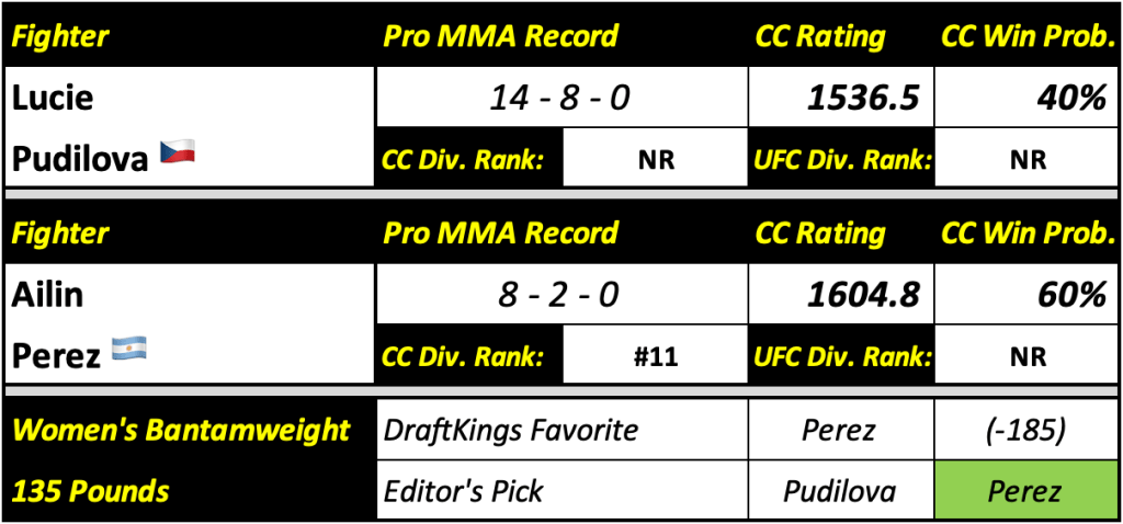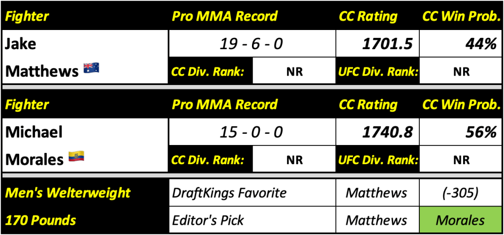 All win probabilities are based off of a fighter’s Cage Calculus (CC) Rating and their place in the CC Rankings. The fighter’s name highlighted in green at the bottom of the panel indicates the editor’s pick to win. Also featured below their record and rating is their divisional rankings in the CC Rankings and the official UFC Rankings. Any fighter falling outside of the top 15 of their respective division is classified as NR (not ranked).
