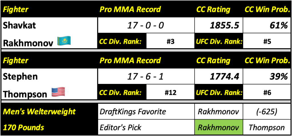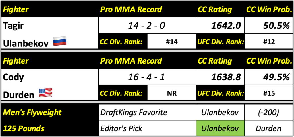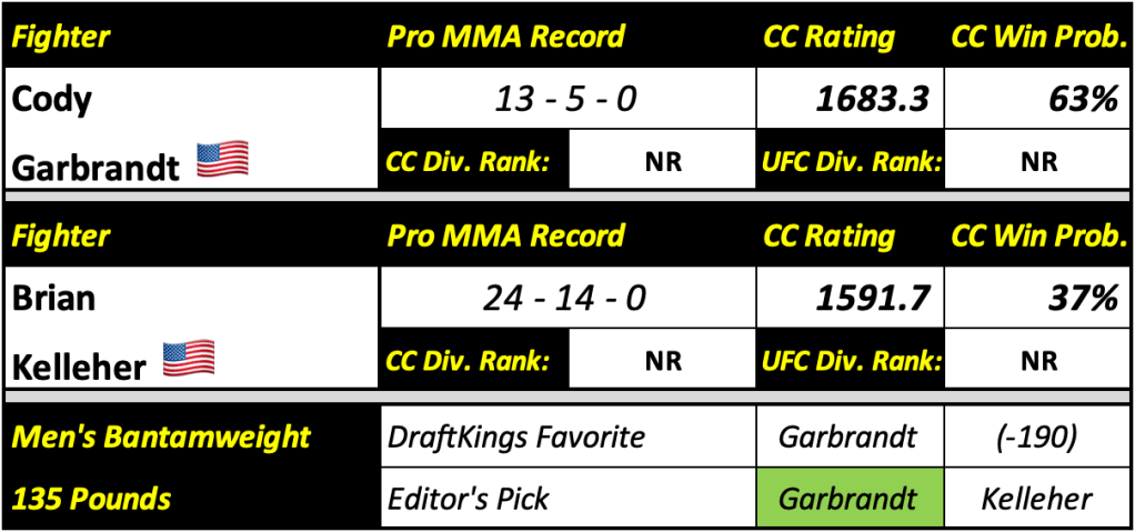 All win probabilities are based off of a fighter’s Cage Calculus (CC) Rating and their place in the CC Rankings. The fighter’s name highlighted in green at the bottom of the panel indicates the editor’s pick to win. Also featured below their record and rating is their divisional rankings in the CC Rankings and the official UFC Rankings. Any fighter falling outside of the top 15 of their respective division is classified as NR (not ranked).