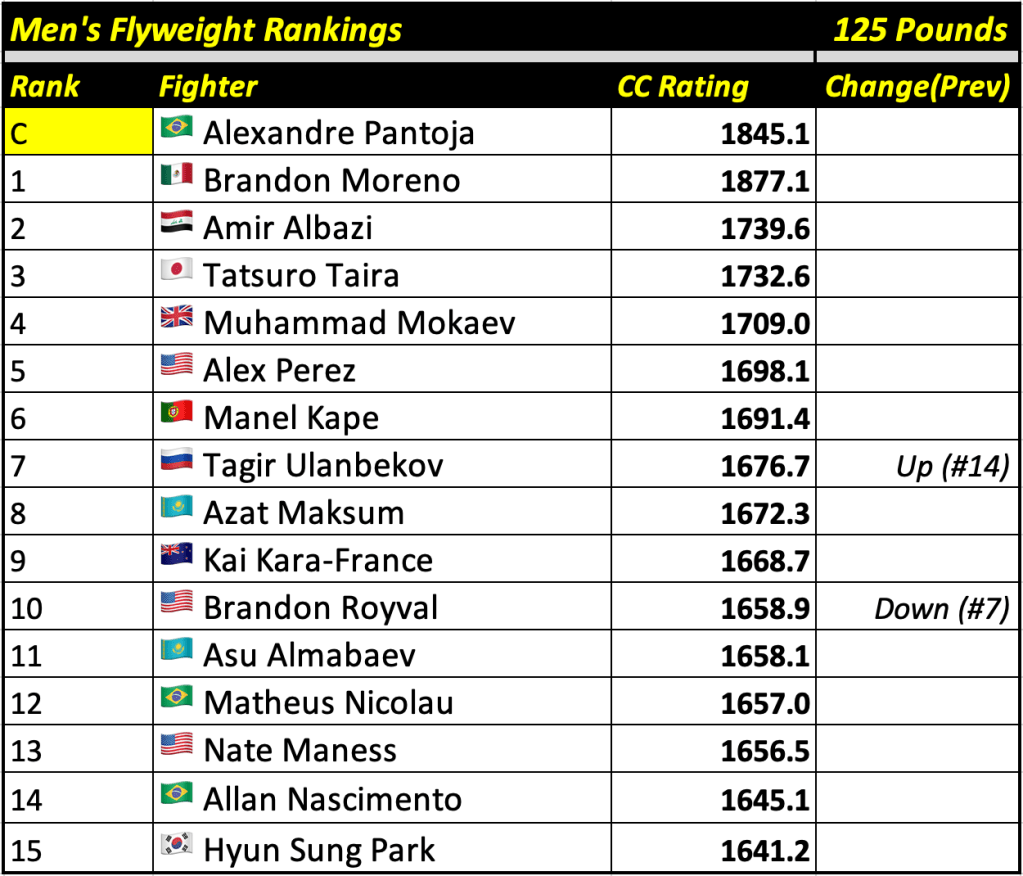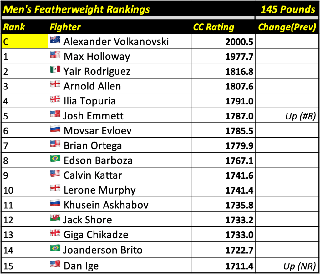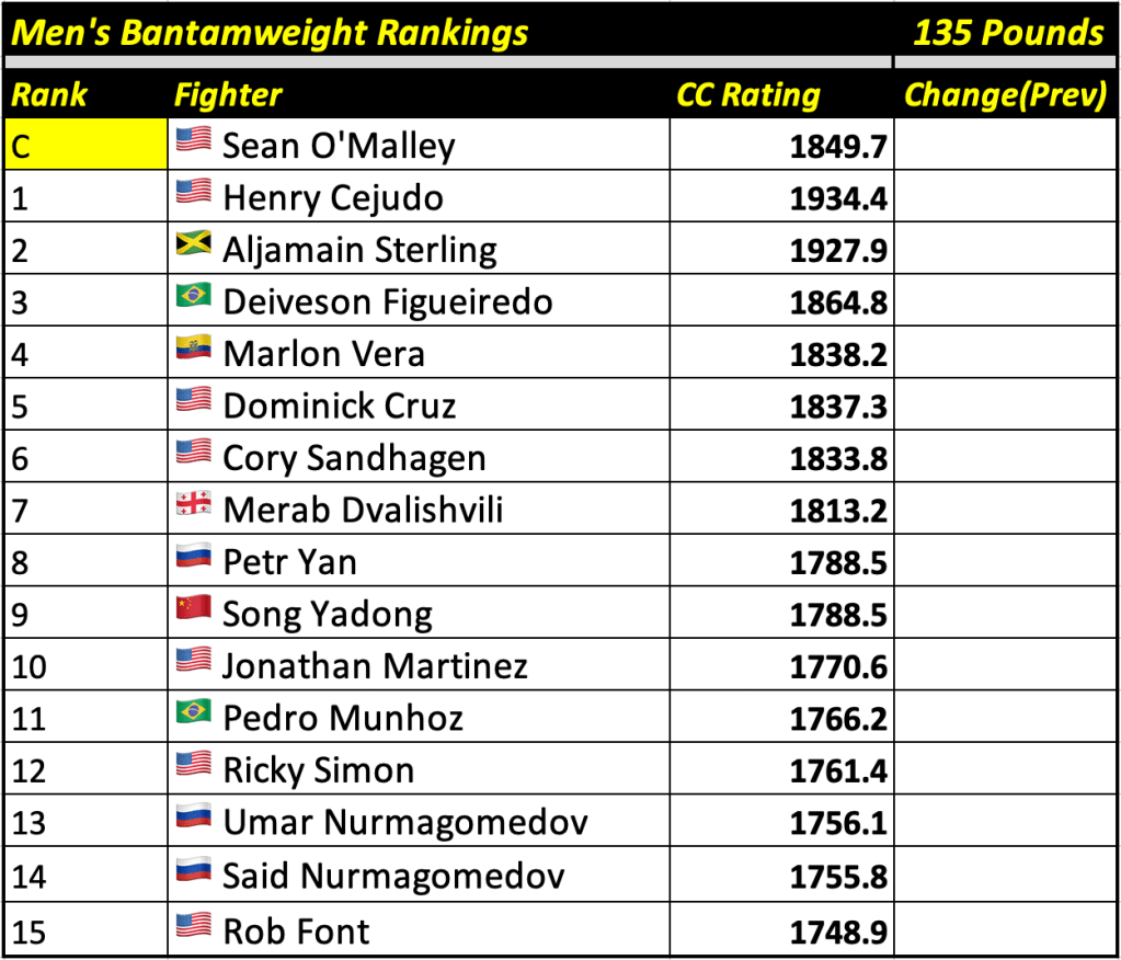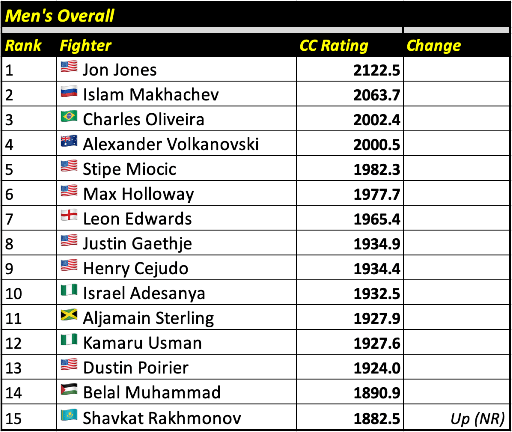 These rankings will also rank the top 15 male and female fighters overall. Note, we do not call them “pound-for-pound” rankings as most do, as the CC Rating is a metric of dominance and performance as opposed to talent relative to size. So, they will simply be called “Overall Male” and “Overall Female” rankings.