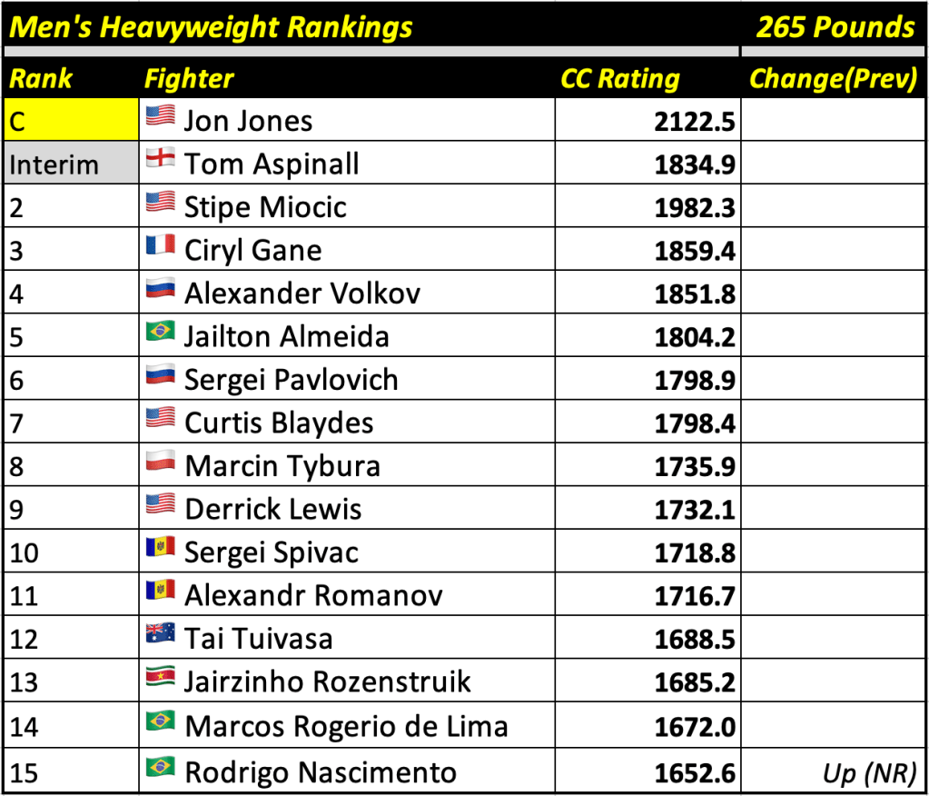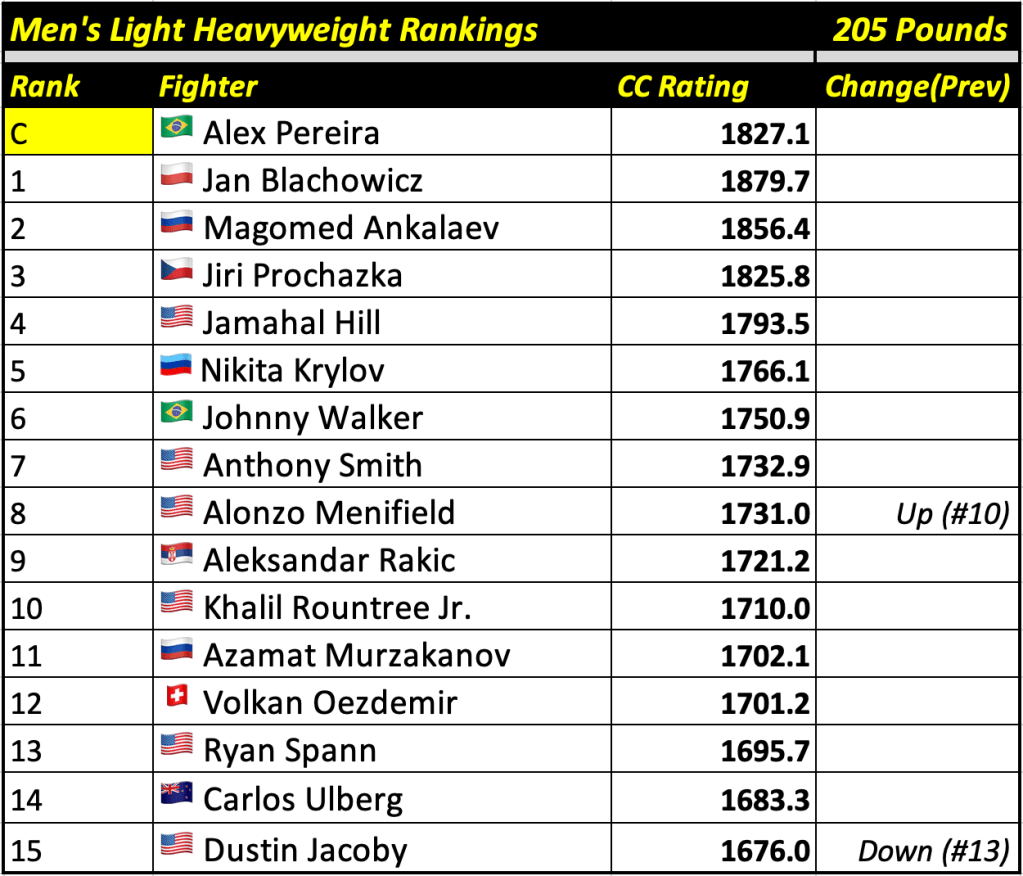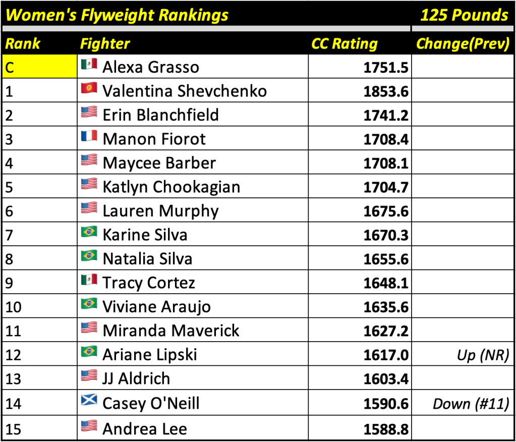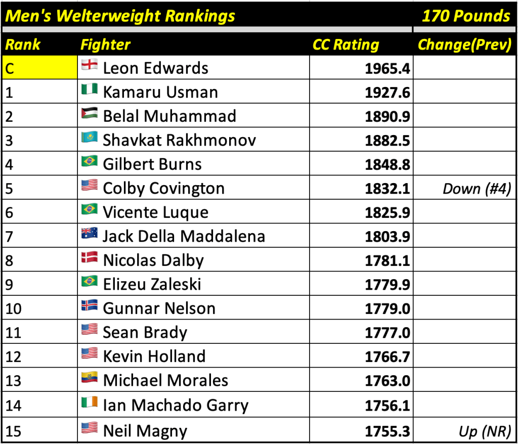 These rankings will also rank the top 15 male and female fighters overall. Note, we do not call them “pound-for-pound” rankings as most do, as the CC Rating is a metric of dominance and performance as opposed to talent relative to size. So, they will simply be called “Overall Male” and “Overall Female” rankings.