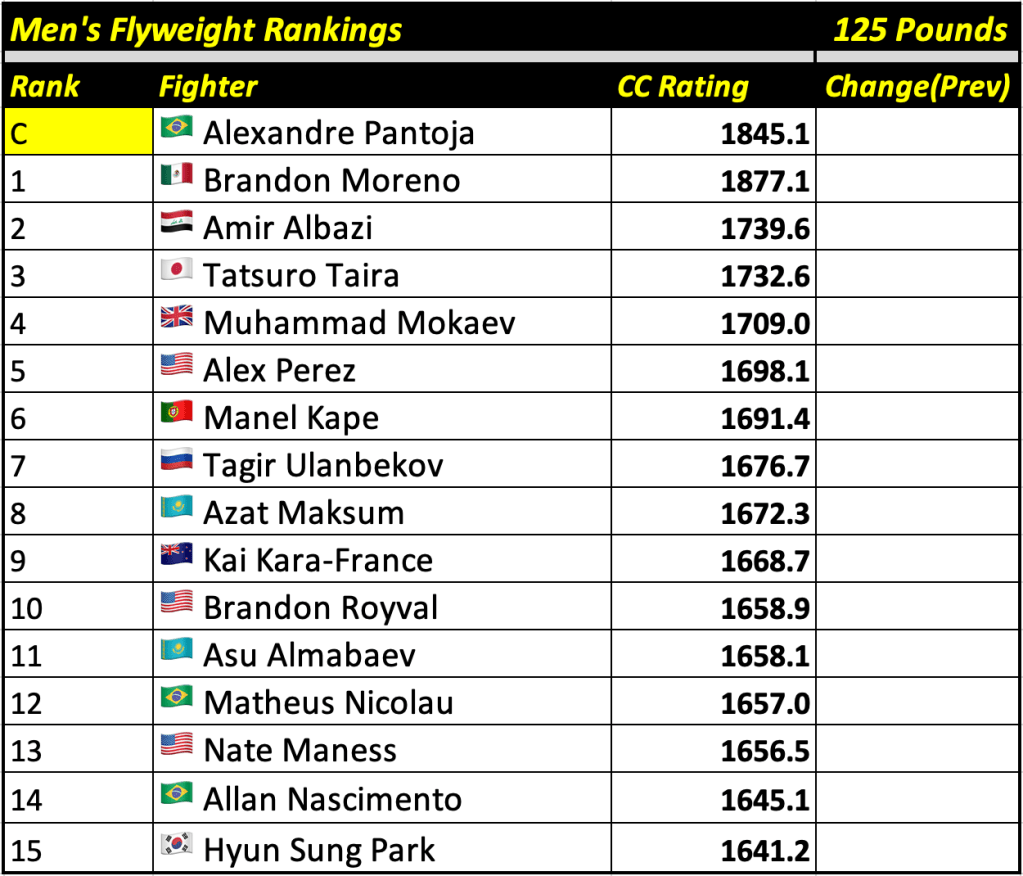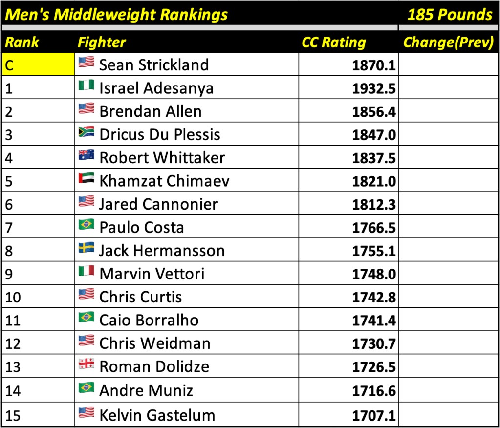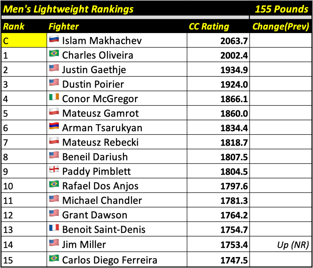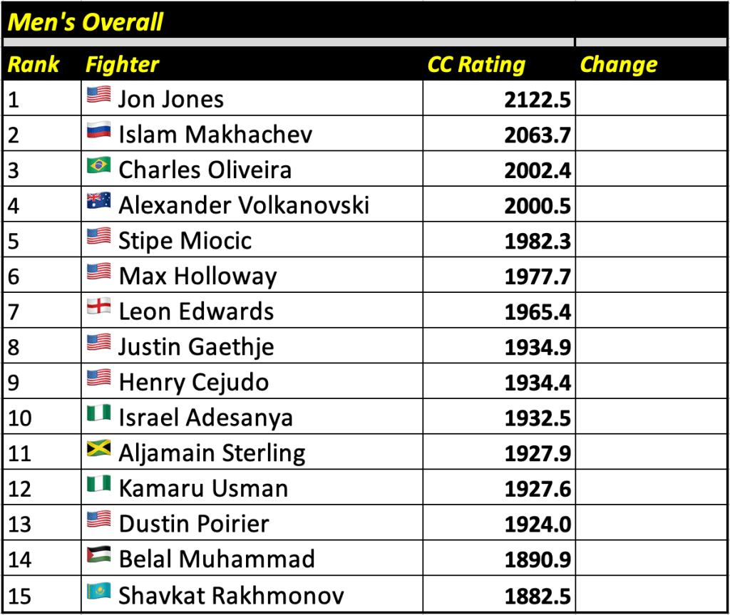 These rankings will also rank the top 15 male and female fighters overall. Note, we do not call them “pound-for-pound” rankings as most do, as the CC Rating is a metric of dominance and performance as opposed to talent relative to size. So, they will simply be called “Overall Male” and “Overall Female” rankings.
