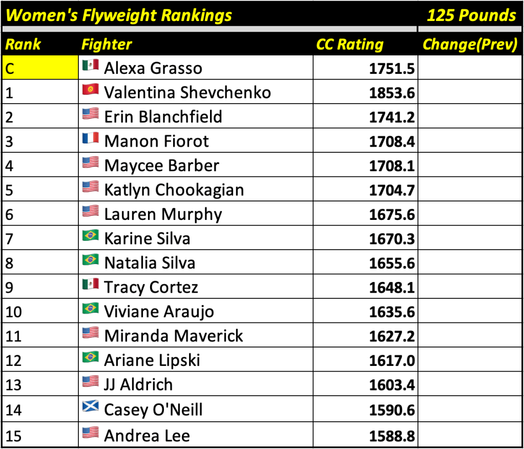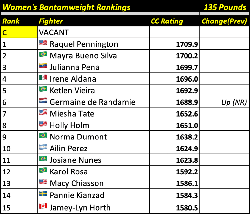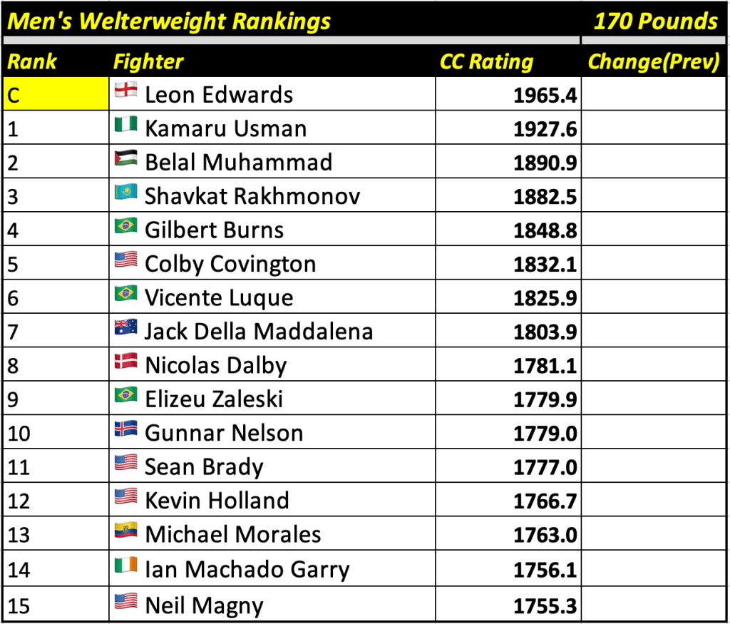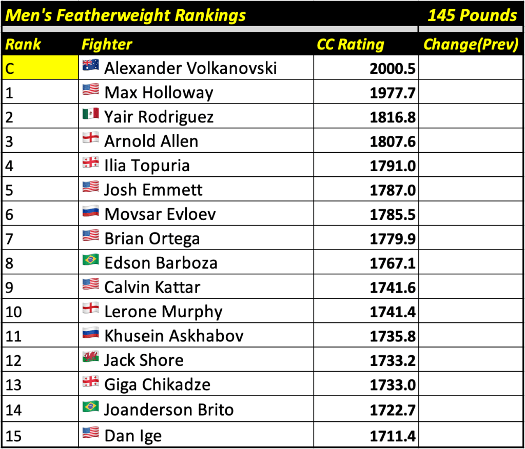 These rankings will also rank the top 15 male and female fighters overall. Note, we do not call them “pound-for-pound” rankings as most do, as the CC Rating is a metric of dominance and performance as opposed to talent relative to size. So, they will simply be called “Overall Male” and “Overall Female” rankings.