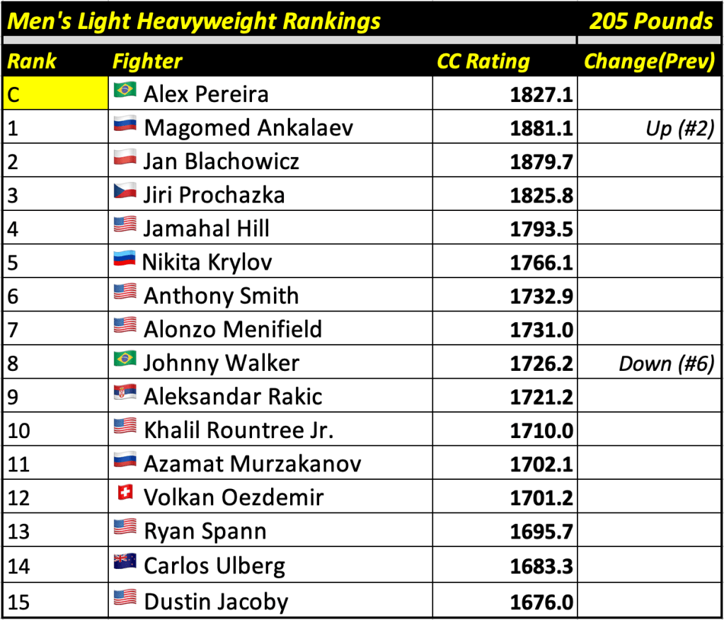 After every UFC fight card, Cage Calculus will publish up-to-date rankings based on our forecast algorithm. The rankings will display the champion and the top 15 contenders in each weight division, alongside their CC Rating (the champion will always be displayed at the top regardless of whether or not they are the highest rated fighter in their division).