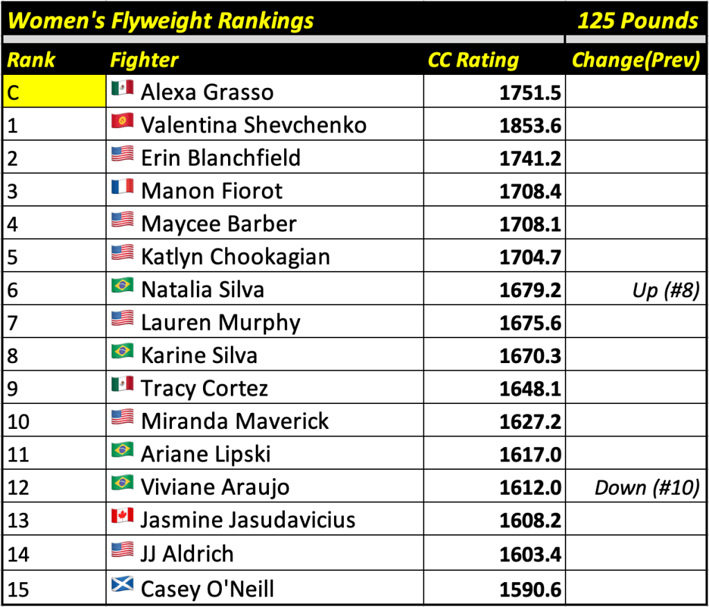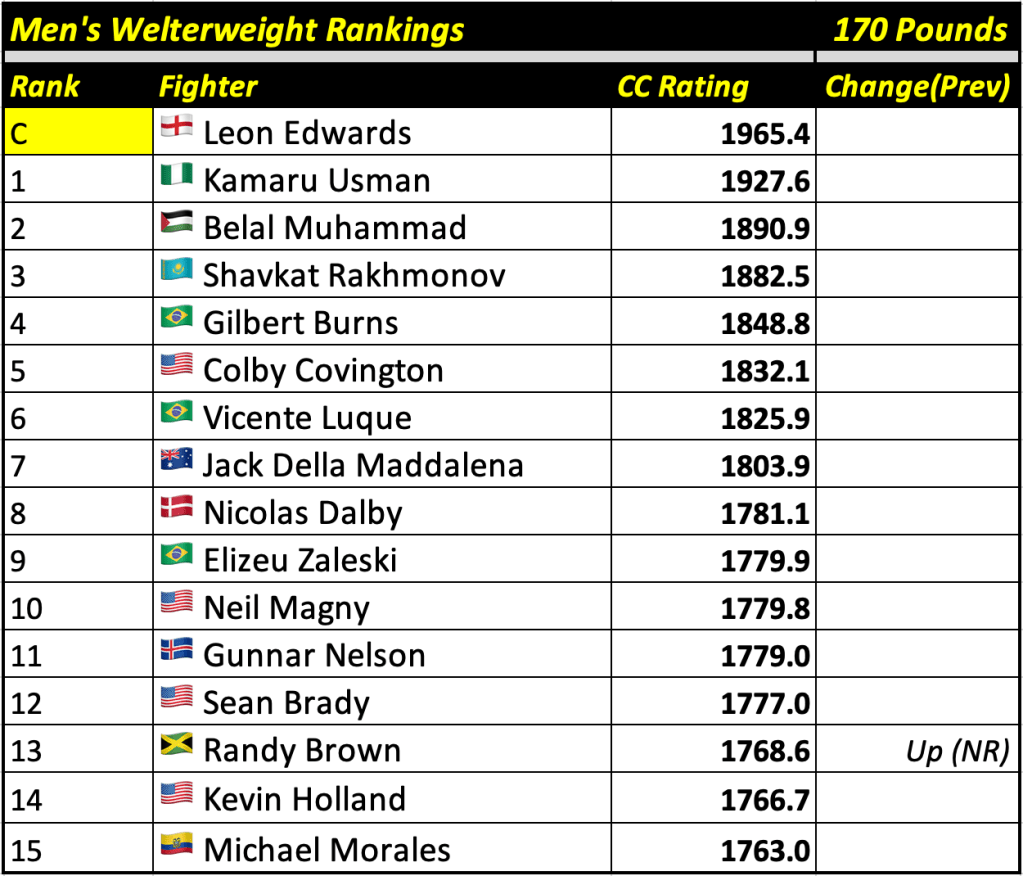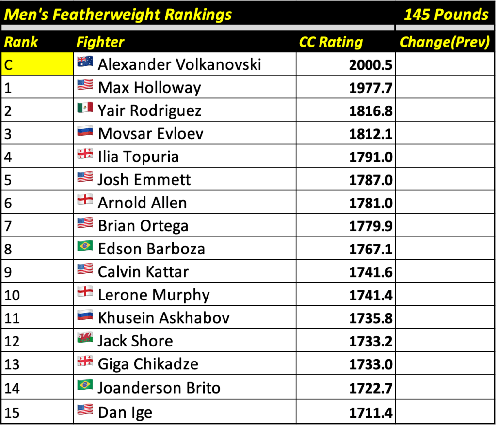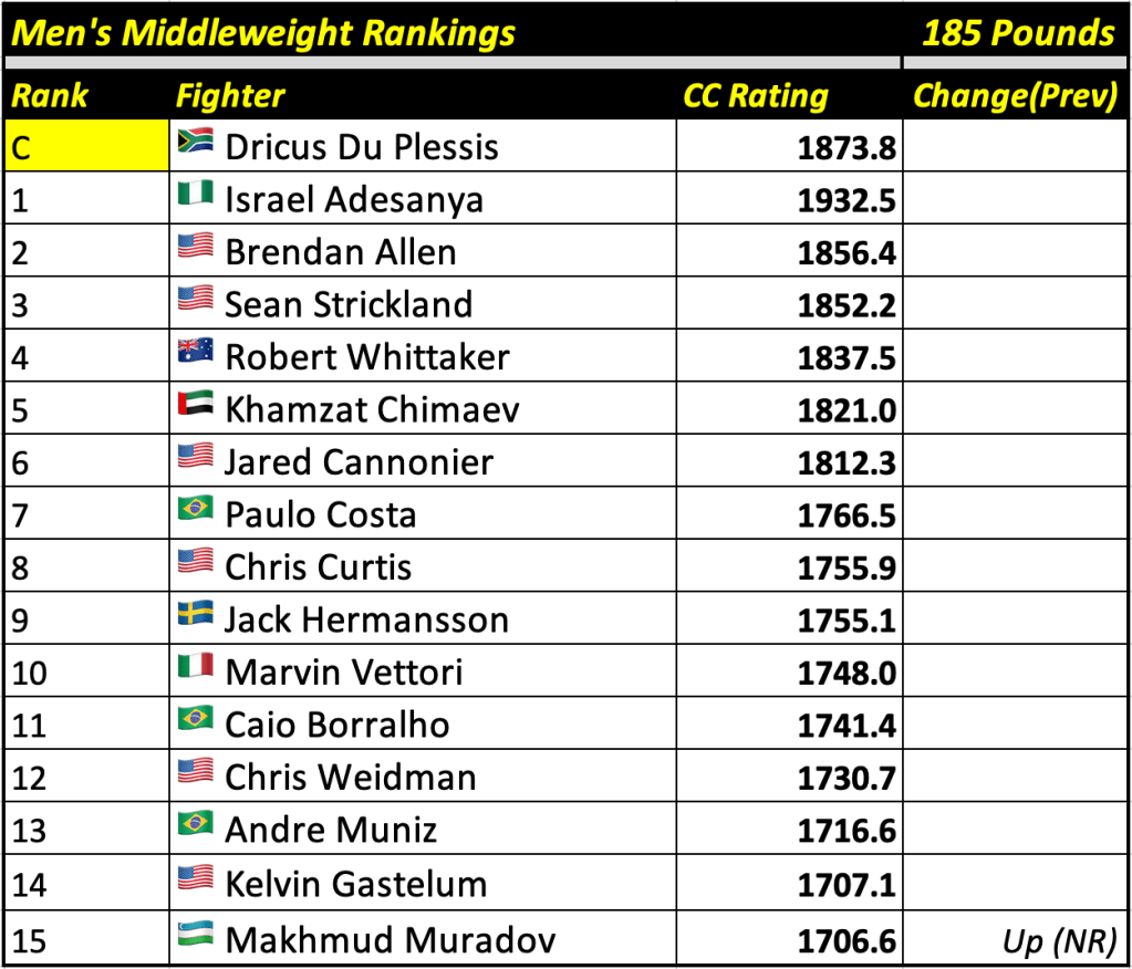 These rankings will also rank the top 15 male and female fighters overall. Note, we do not call them “pound-for-pound” rankings as most do, as the CC Rating is a metric of dominance and performance as opposed to talent relative to size. So, they will simply be called “Overall Male” and “Overall Female” rankings.