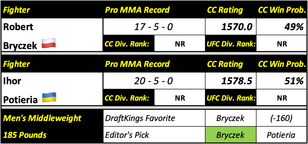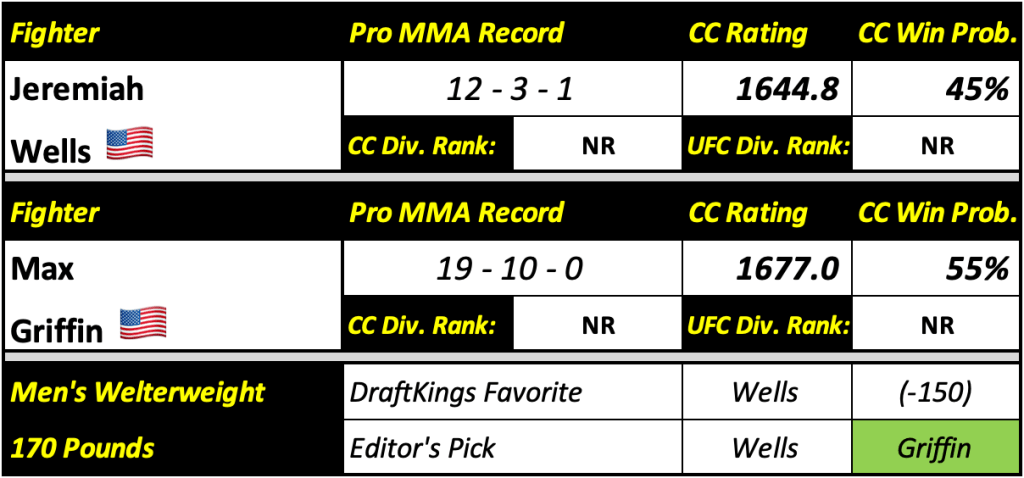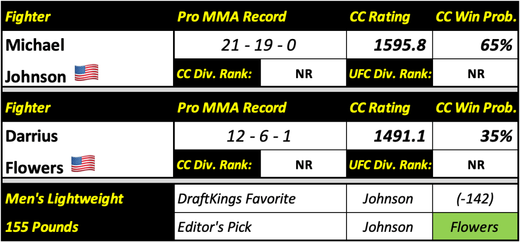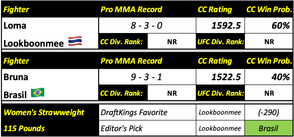 All win probabilities are based off of a fighter’s Cage Calculus (CC) Rating and their place in the CC Rankings. The fighter’s name highlighted in green at the bottom of the panel indicates the editor’s pick to win. Also featured below their record and rating is their divisional rankings in the CC Rankings and the official UFC Rankings. Any fighter falling outside of the top 15 of their respective division is classified as NR (not ranked).