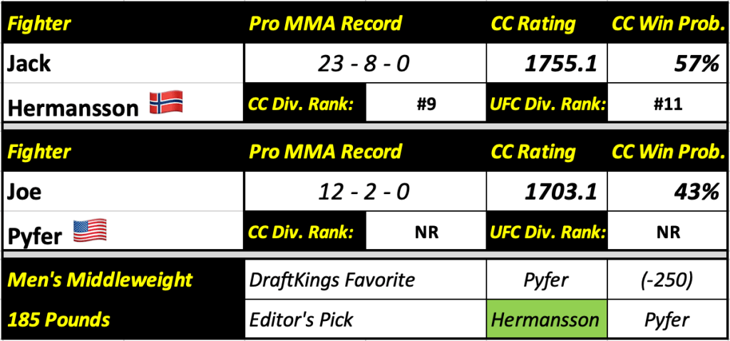 The UFC Vegas 86 card features fourteen bouts, all of which will be previewed in this post. The card will be headlined by a bout between middleweight contender Jack Hermansson (pictured left) and hard-hitting rising star Joe Pyfer (pictured right).