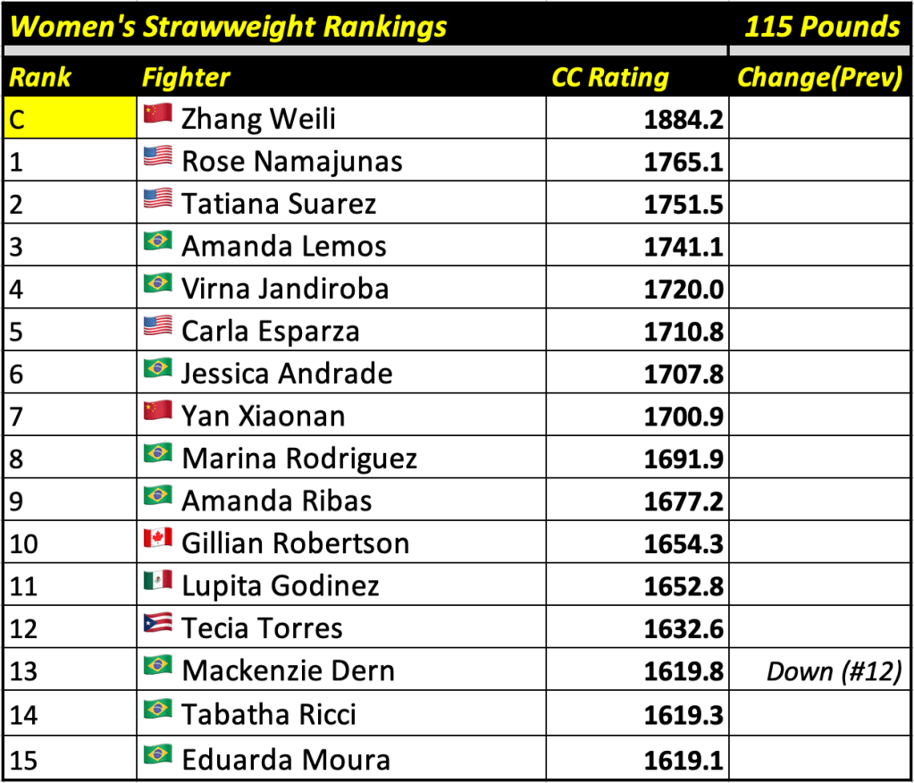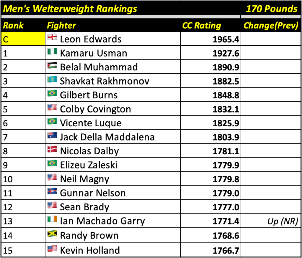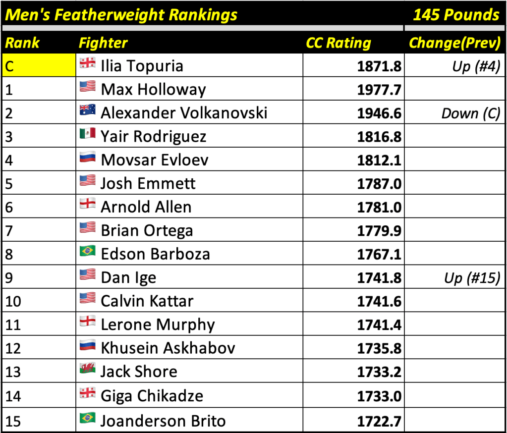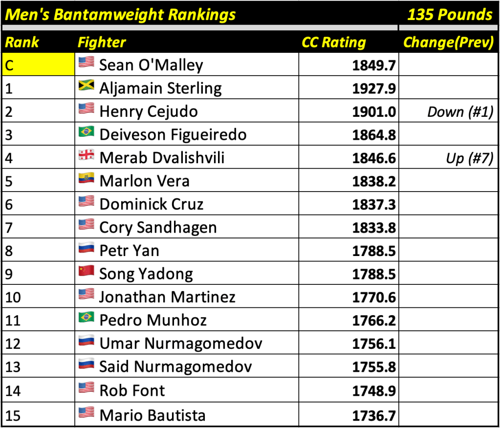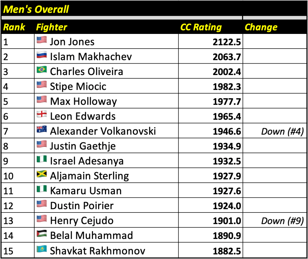 These rankings will also rank the top 15 male and female fighters overall. Note, we do not call them “pound-for-pound” rankings as most do, as the CC Rating is a metric of dominance and performance as opposed to talent relative to size. So, they will simply be called “Overall Male” and “Overall Female” rankings.
