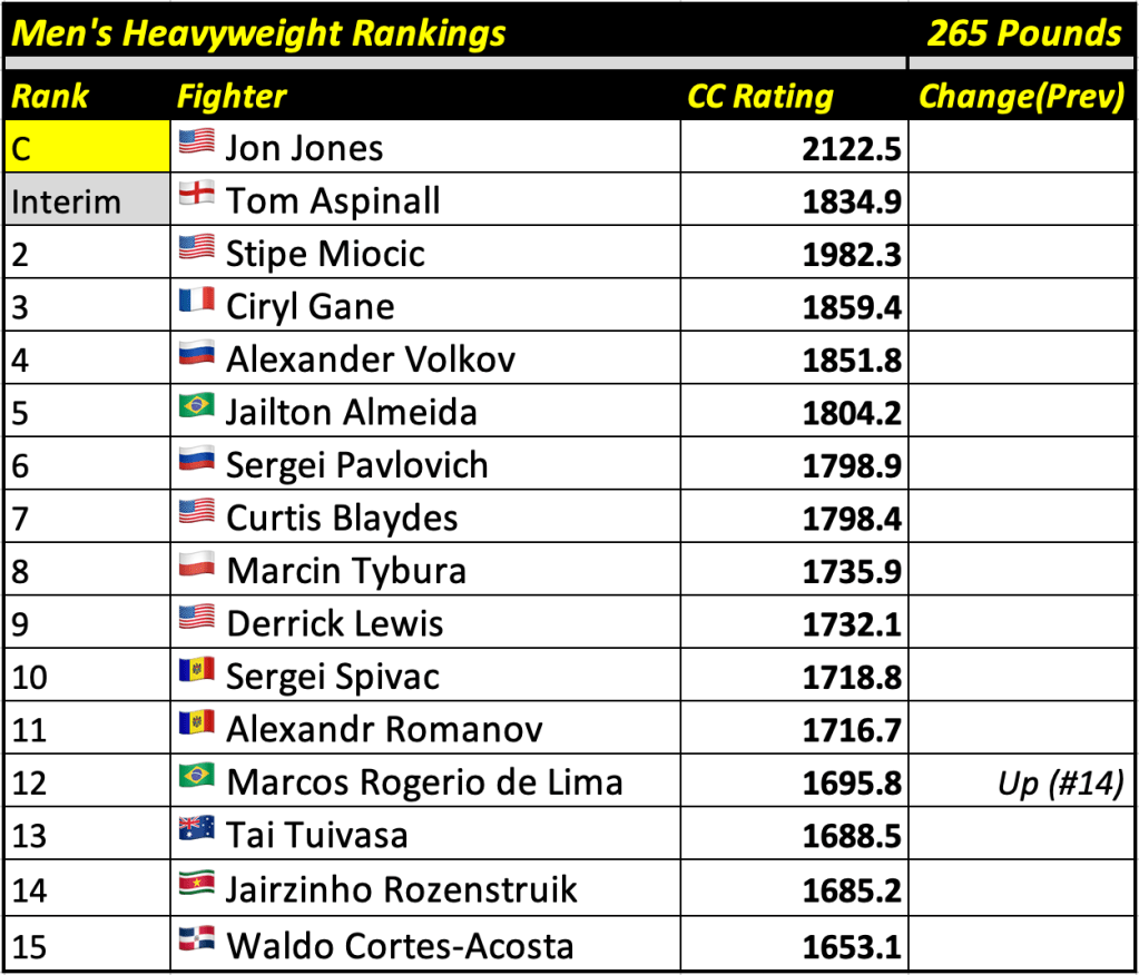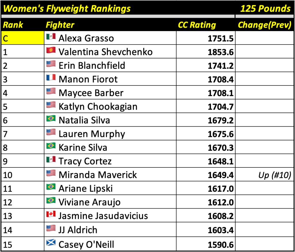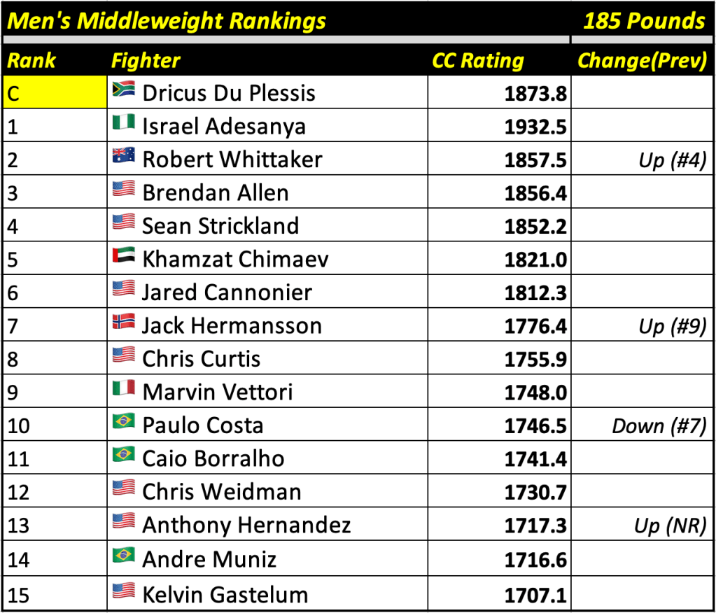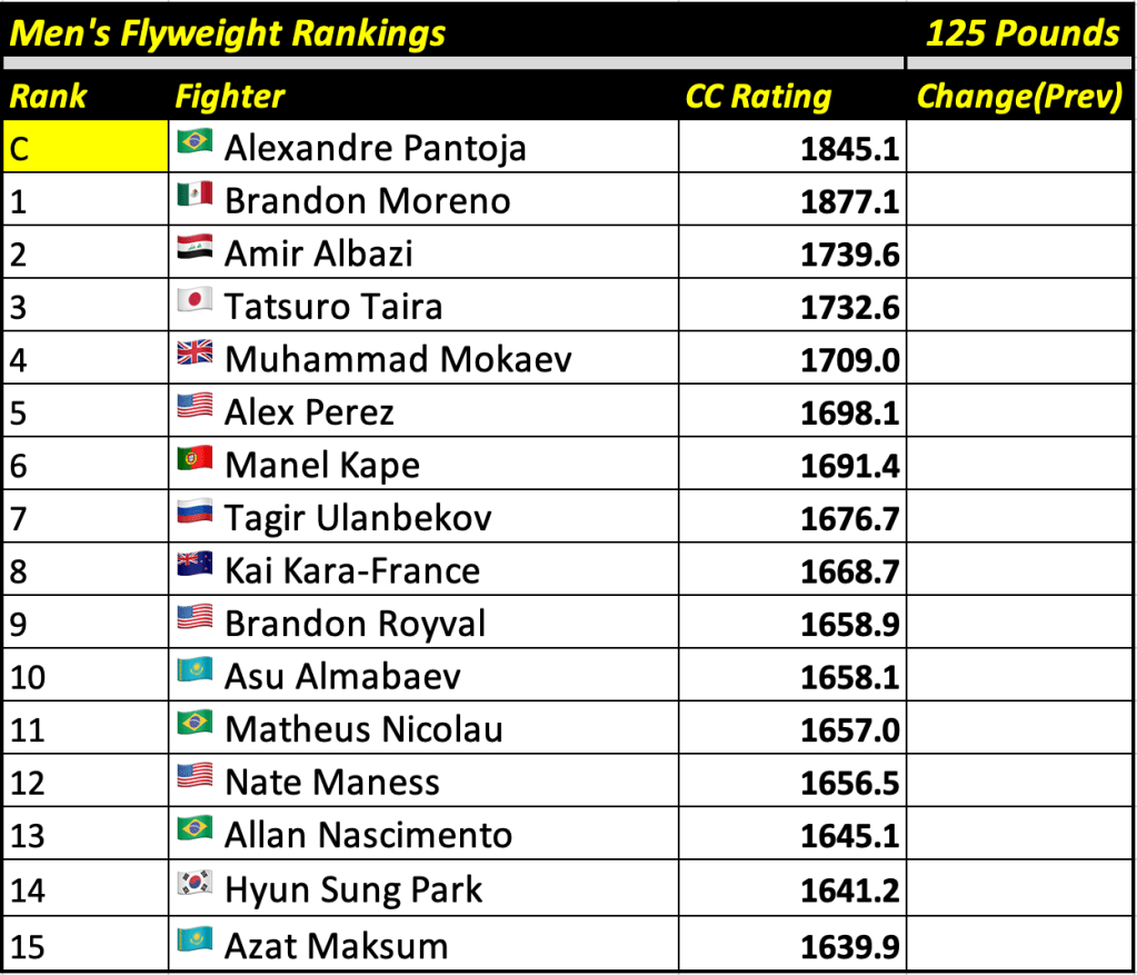 These rankings will also rank the top 15 male and female fighters overall. Note, we do not call them “pound-for-pound” rankings as most do, as the CC Rating is a metric of dominance and performance as opposed to talent relative to size. So, they will simply be called “Overall Male” and “Overall Female” rankings.
