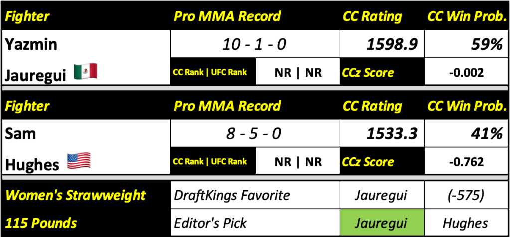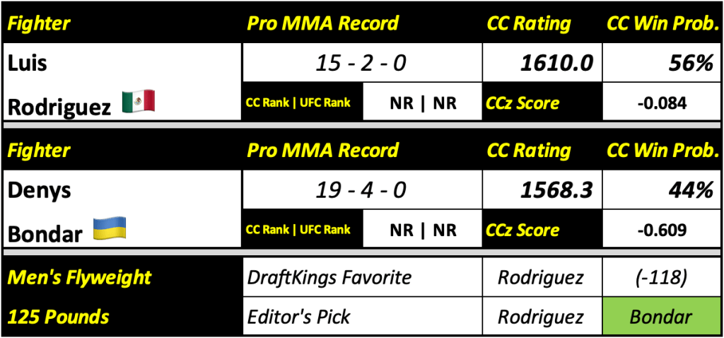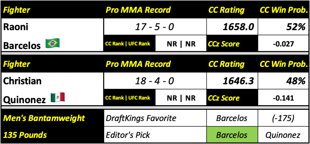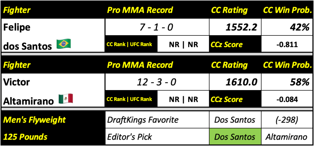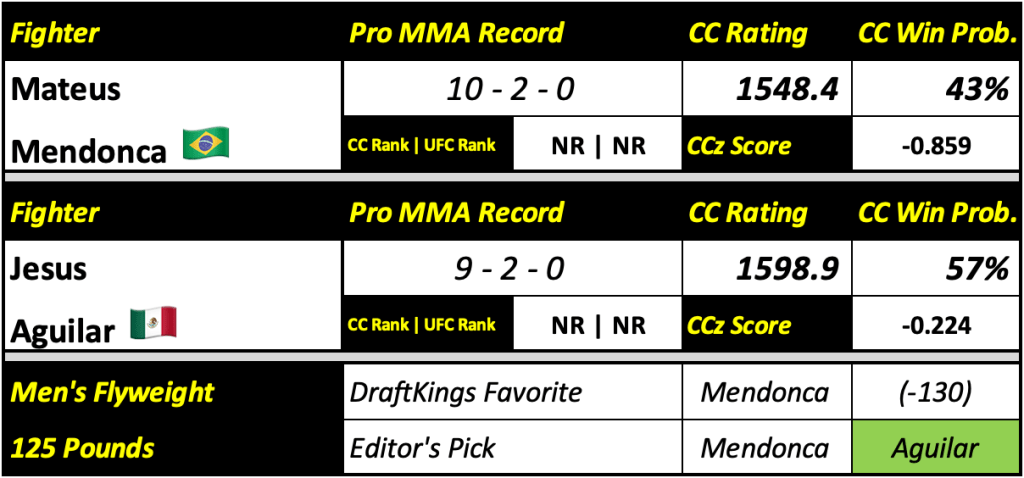 All win probabilities are based off of a fighter’s Cage Calculus (CC) Rating and their place in the CC Rankings. The fighter’s name highlighted in green at the bottom of the panel indicates the editor’s pick to win. Also featured below their record and rating is their divisional rankings in the CC Rankings and the official UFC Rankings. Any fighter falling outside of the top 15 of their respective division is classified as NR (not ranked).