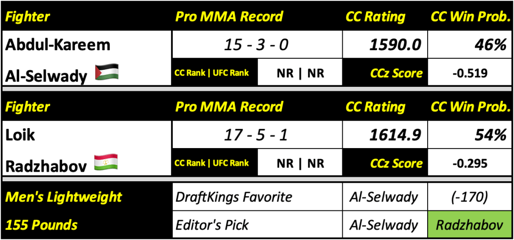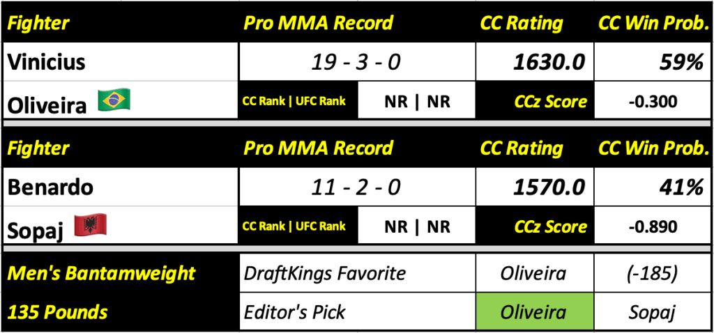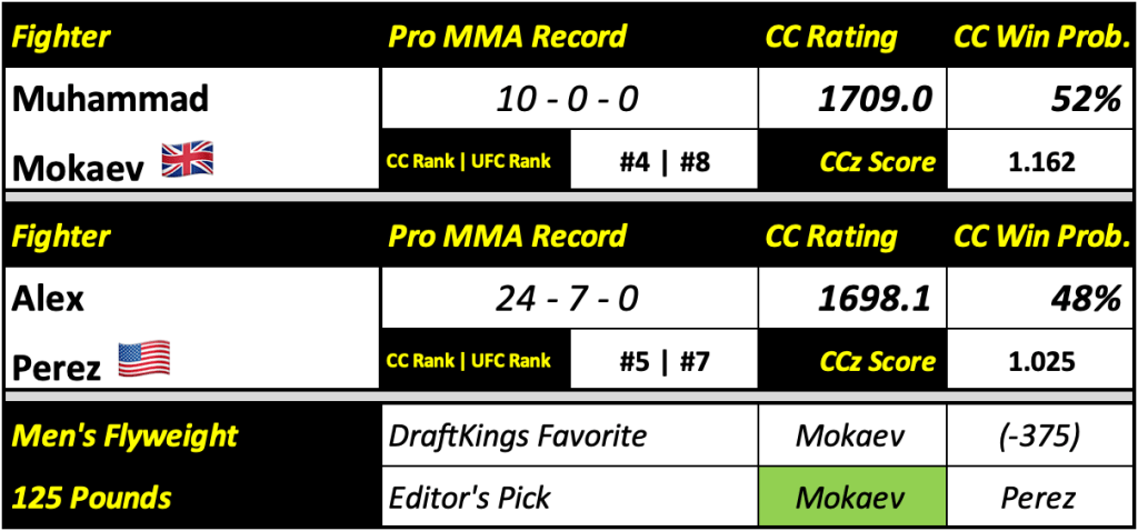 All win probabilities are based off of a fighter’s Cage Calculus (CC) Rating and their place in the CC Rankings. The fighter’s name highlighted in green at the bottom of the panel indicates the editor’s pick to win. Also featured below their record and rating is their divisional rankings in the CC Rankings and the official UFC Rankings. Any fighter falling outside of the top 15 of their respective division is classified as NR (not ranked).