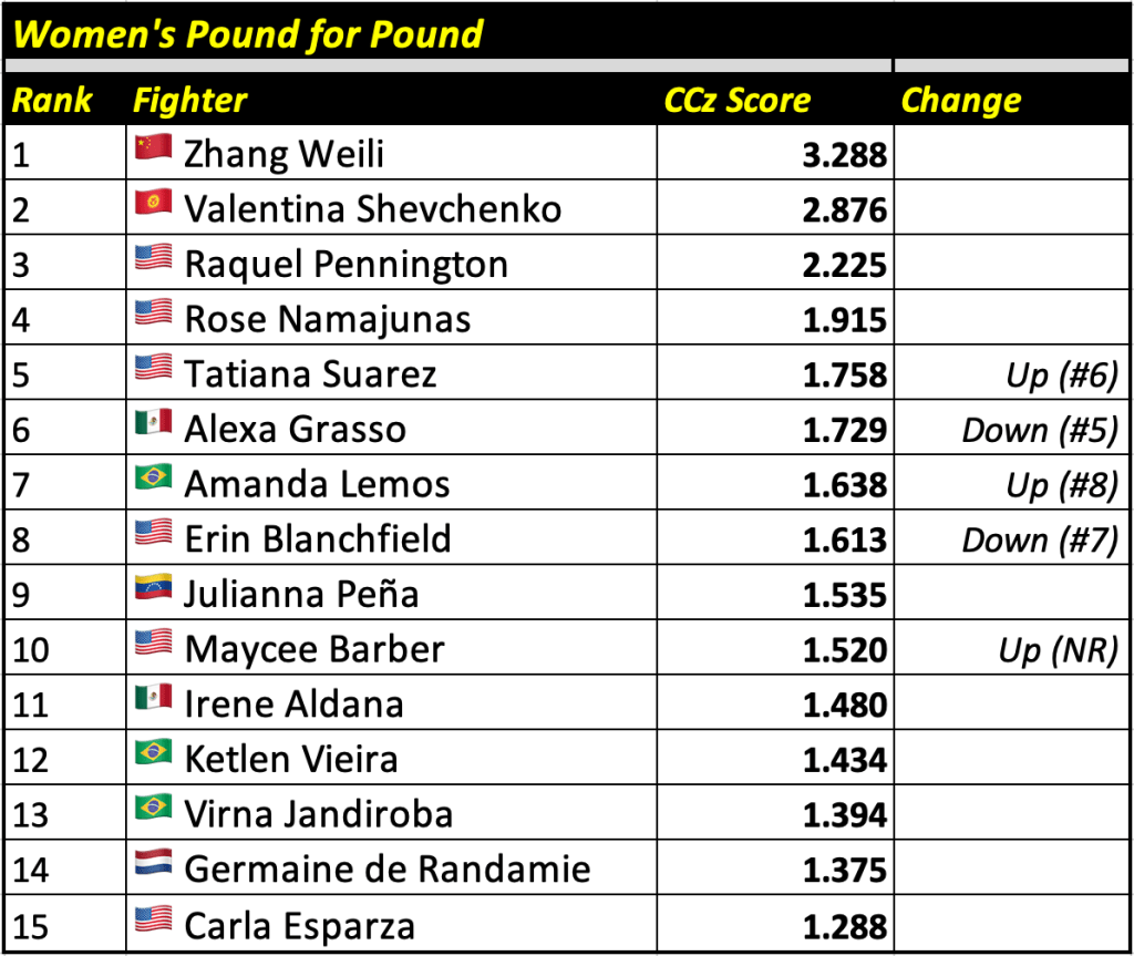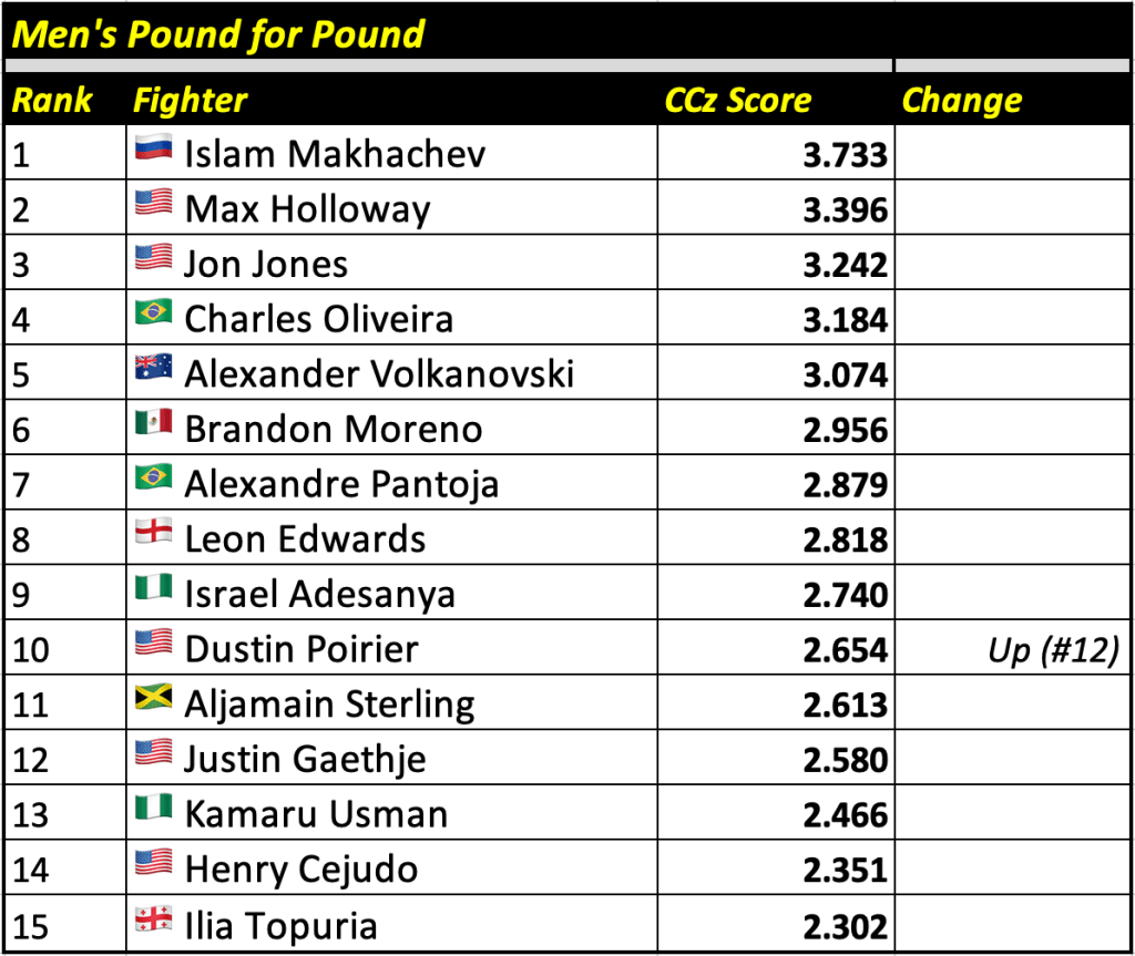 The Cage Calculus Pound for Pound Rankings is based on a fighter’s CCz Score. The CCz Score is a score that shows how much better a given fighter is than the average fighter in their respective weight class.
