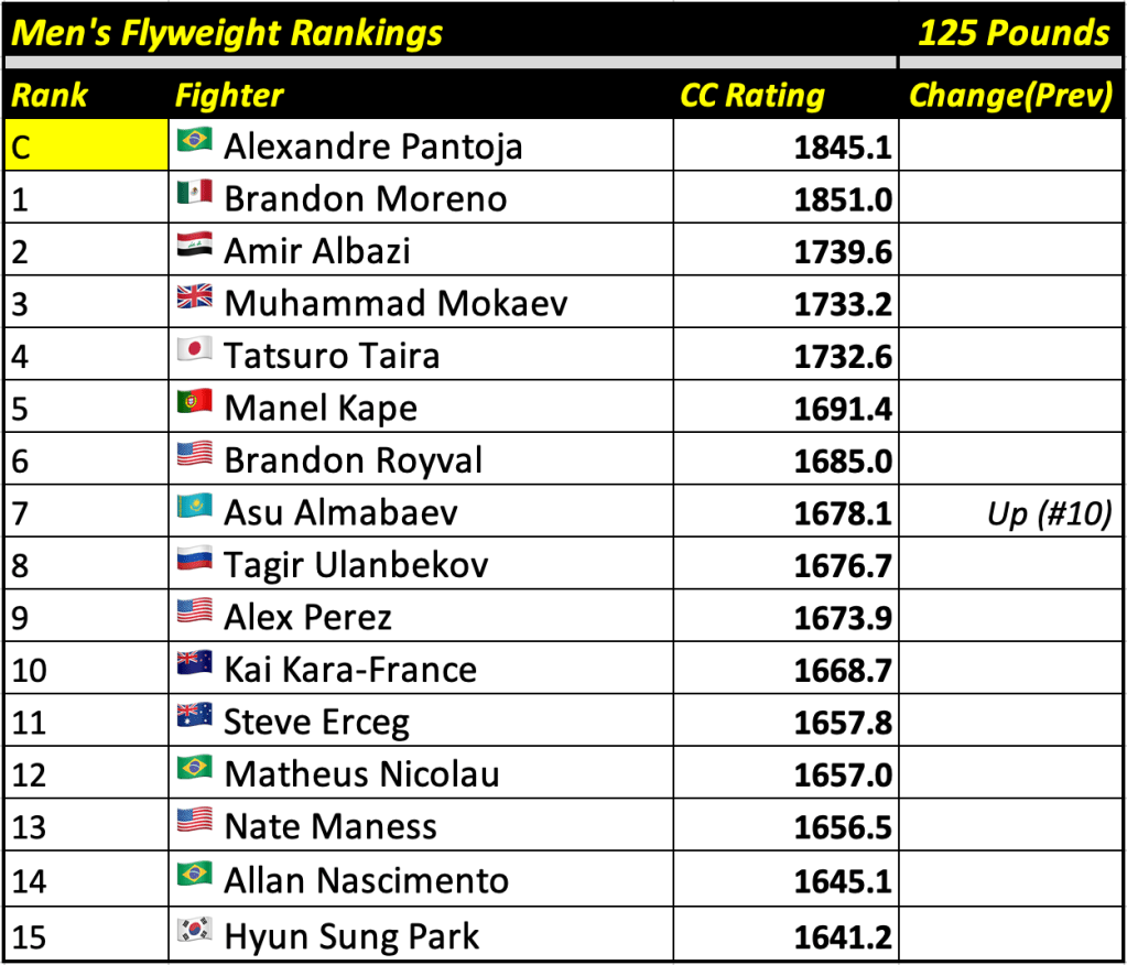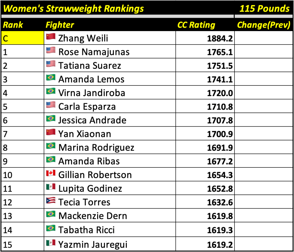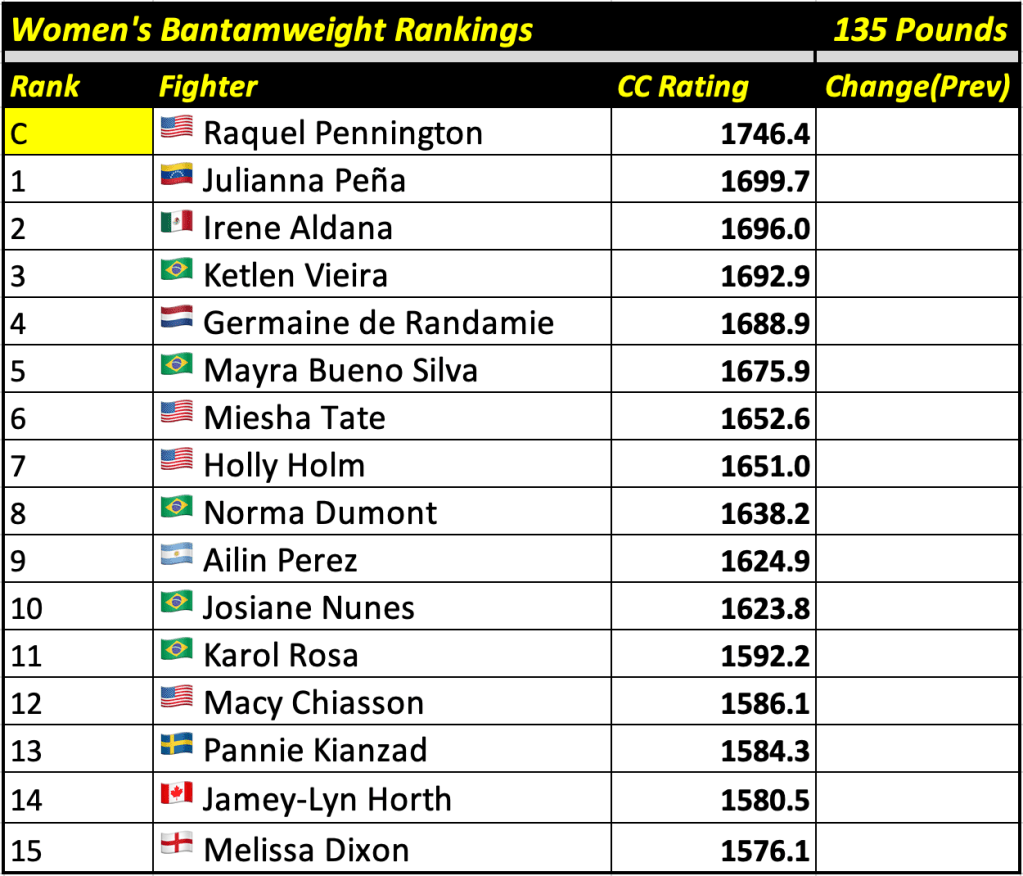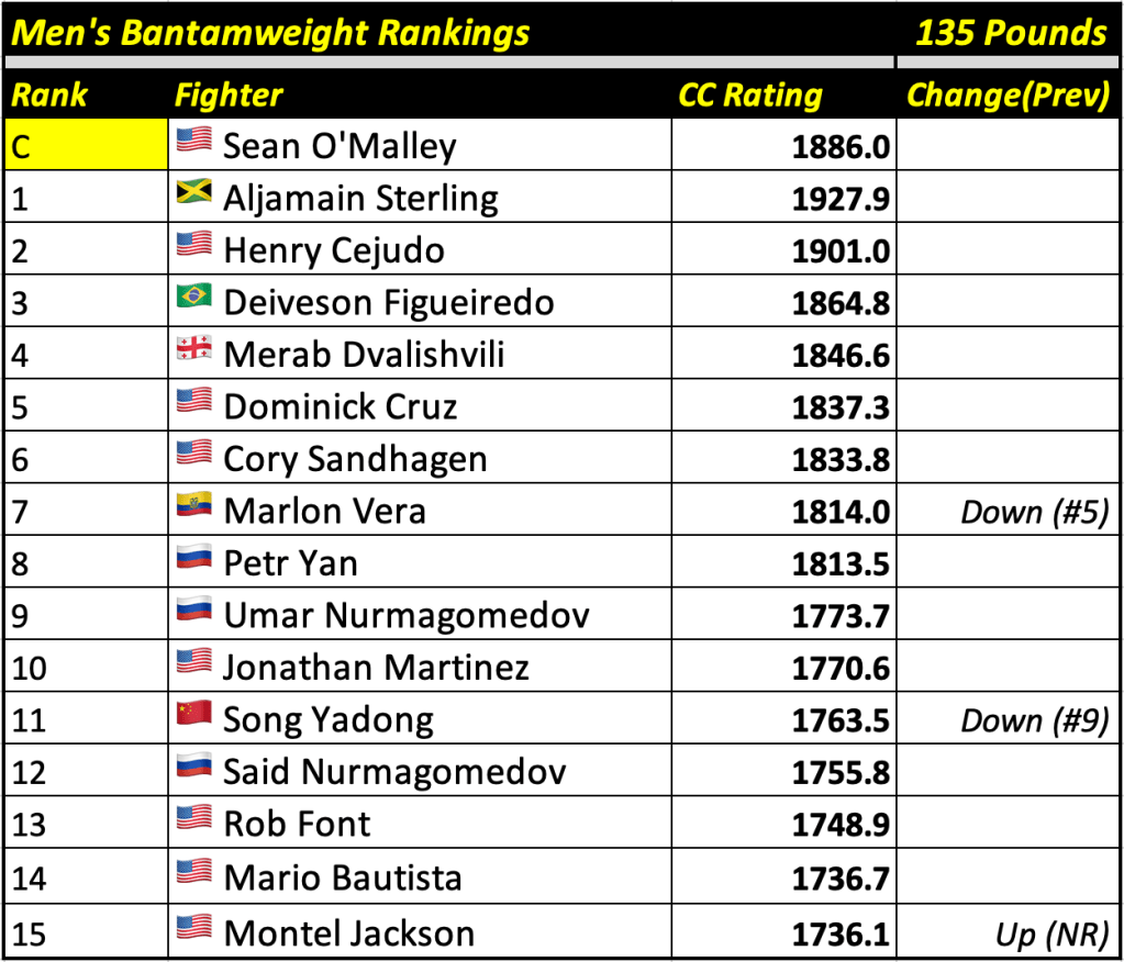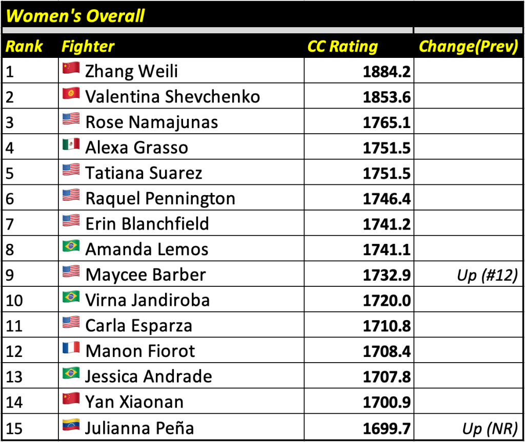 These rankings will also rank the top 15 male and female fighters overall. Note, we do not call them “pound-for-pound” rankings as most do, as the CC Rating is a metric of dominance and performance as opposed to talent relative to size. So, they will simply be called “Overall Male” and “Overall Female” rankings.