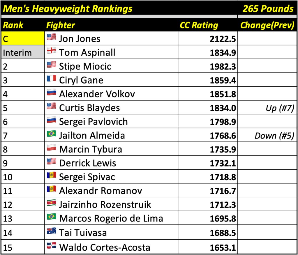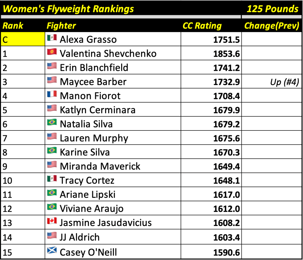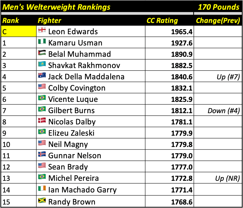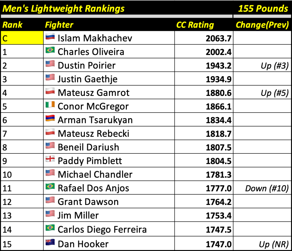 These rankings will also rank the top 15 male and female fighters overall. Note, we do not call them “pound-for-pound” rankings as most do, as the CC Rating is a metric of dominance and performance as opposed to talent relative to size. So, they will simply be called “Overall Male” and “Overall Female” rankings.