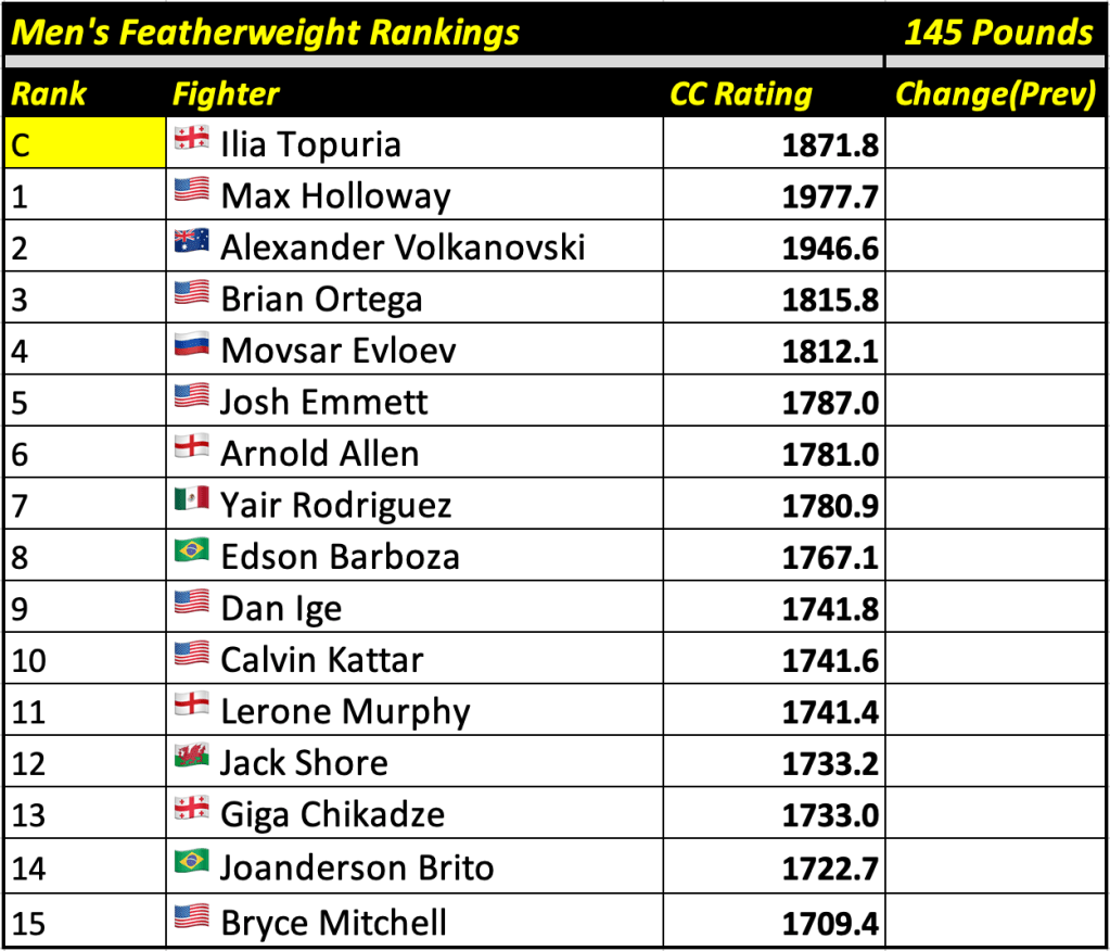 After every UFC fight card, Cage Calculus will publish up-to-date rankings based on our forecast algorithm. The rankings will display the champion and the top 15 contenders in each weight division, alongside their CC Rating (the champion will always be displayed at the top regardless of whether or not they are the highest rated fighter in their division).