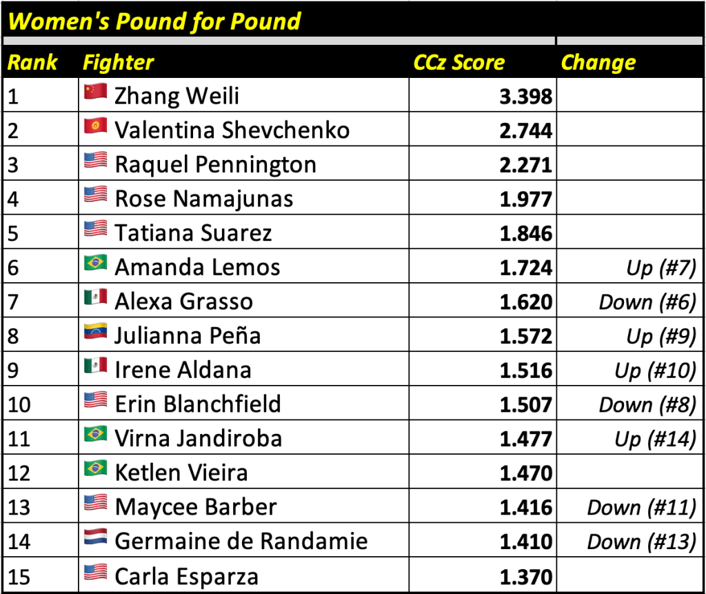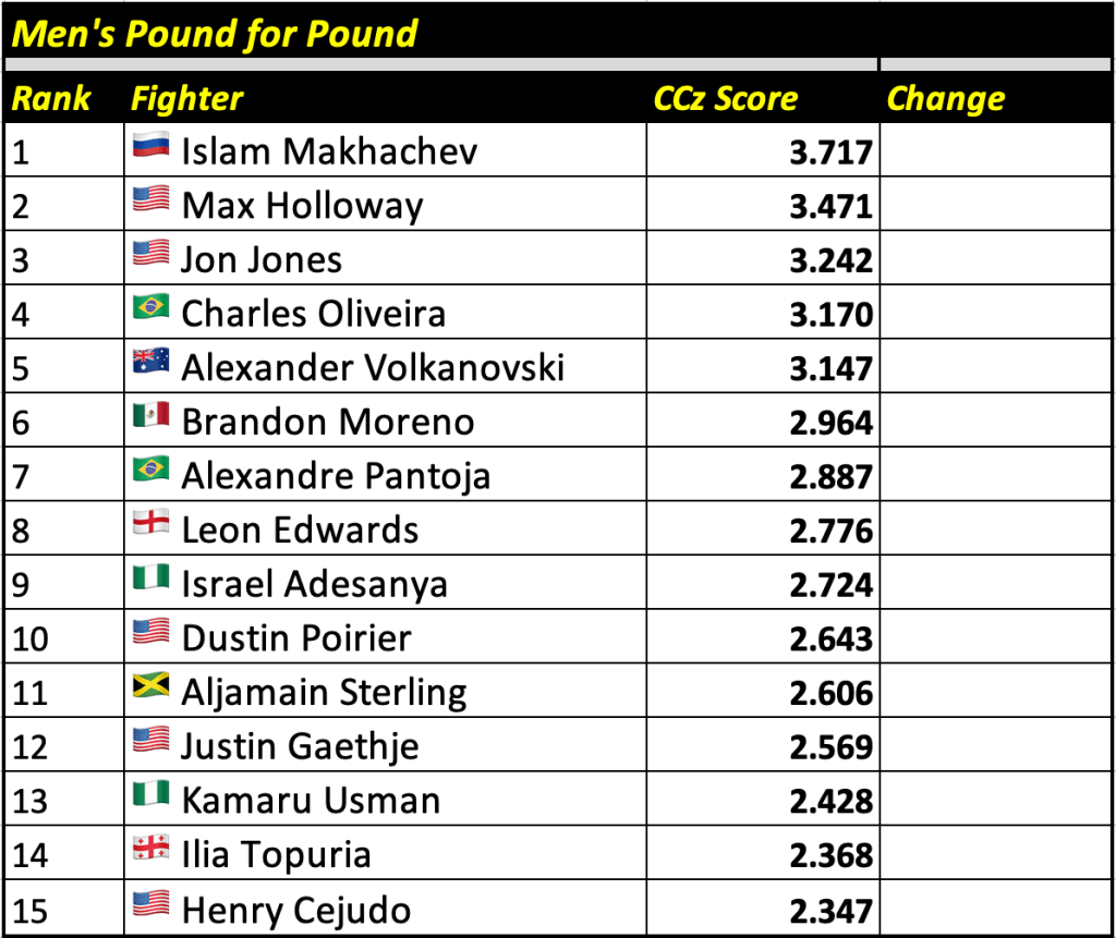 The Cage Calculus Pound for Pound Rankings is based on a fighter’s CCz Score. The CCz Score is a score that shows how much better a given fighter is than the average fighter in their respective weight class.