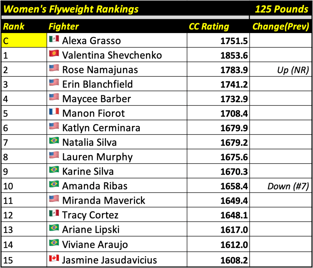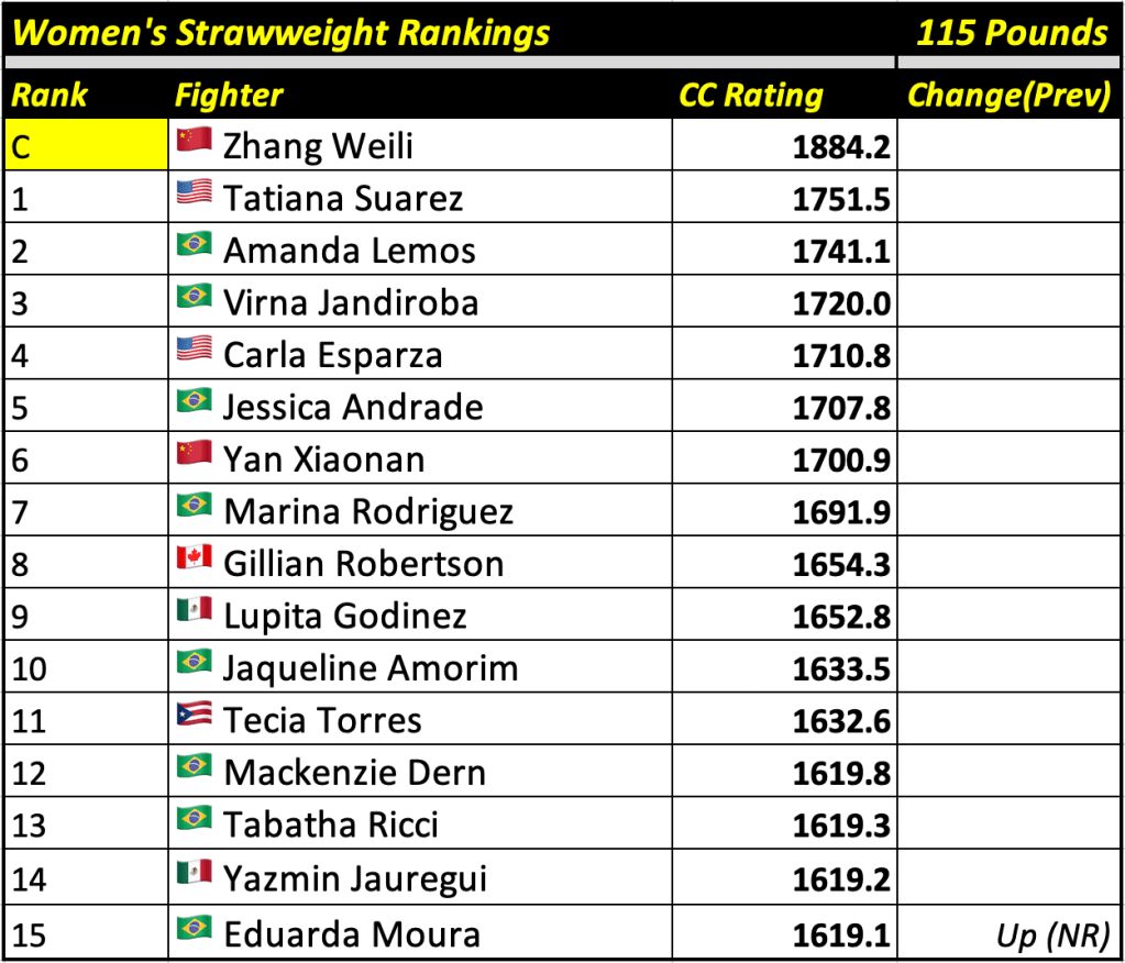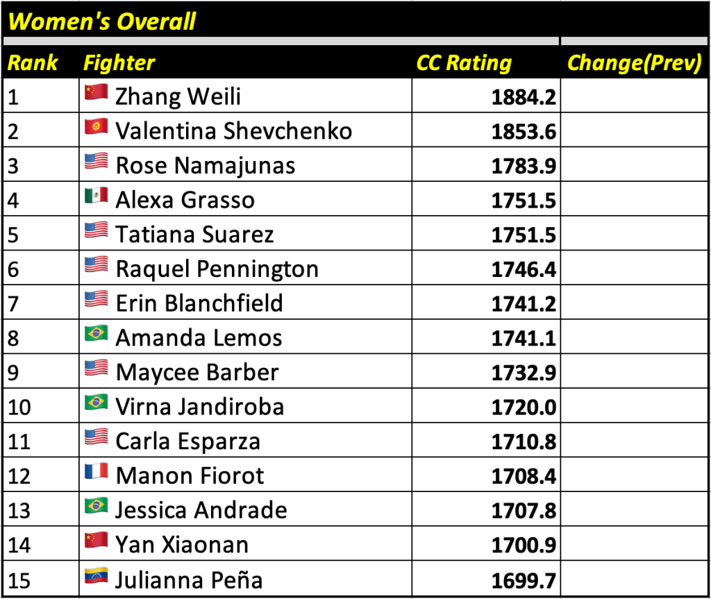 These rankings will also rank the top 15 male and female fighters overall. Note, we do not call them “pound-for-pound” rankings as most do, as the CC Rating is a metric of dominance and performance as opposed to talent relative to size. So, they will simply be called “Overall Male” and “Overall Female” rankings.