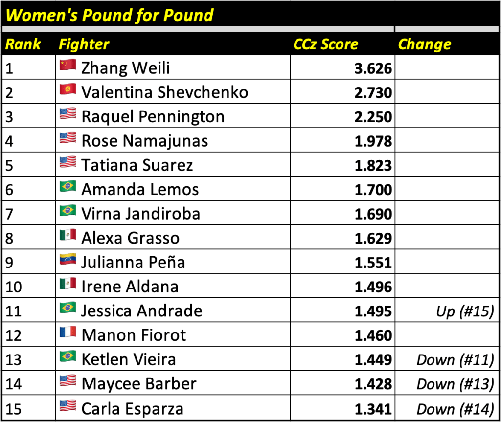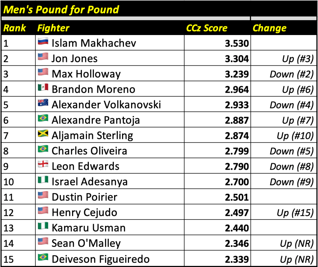 The Cage Calculus Pound for Pound Rankings is based on a fighter’s CCz Score. The CCz Score is a score that shows how much better a given fighter is than the average fighter in their respective weight class.