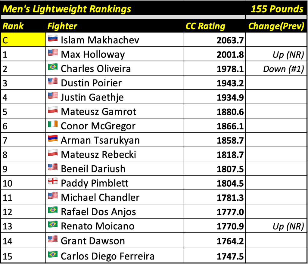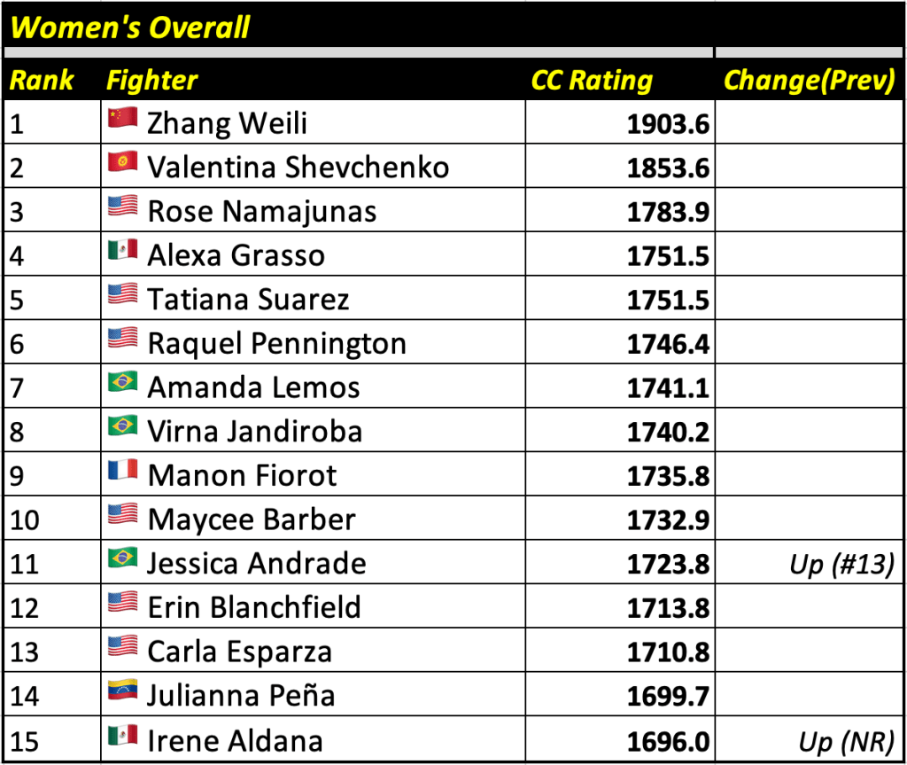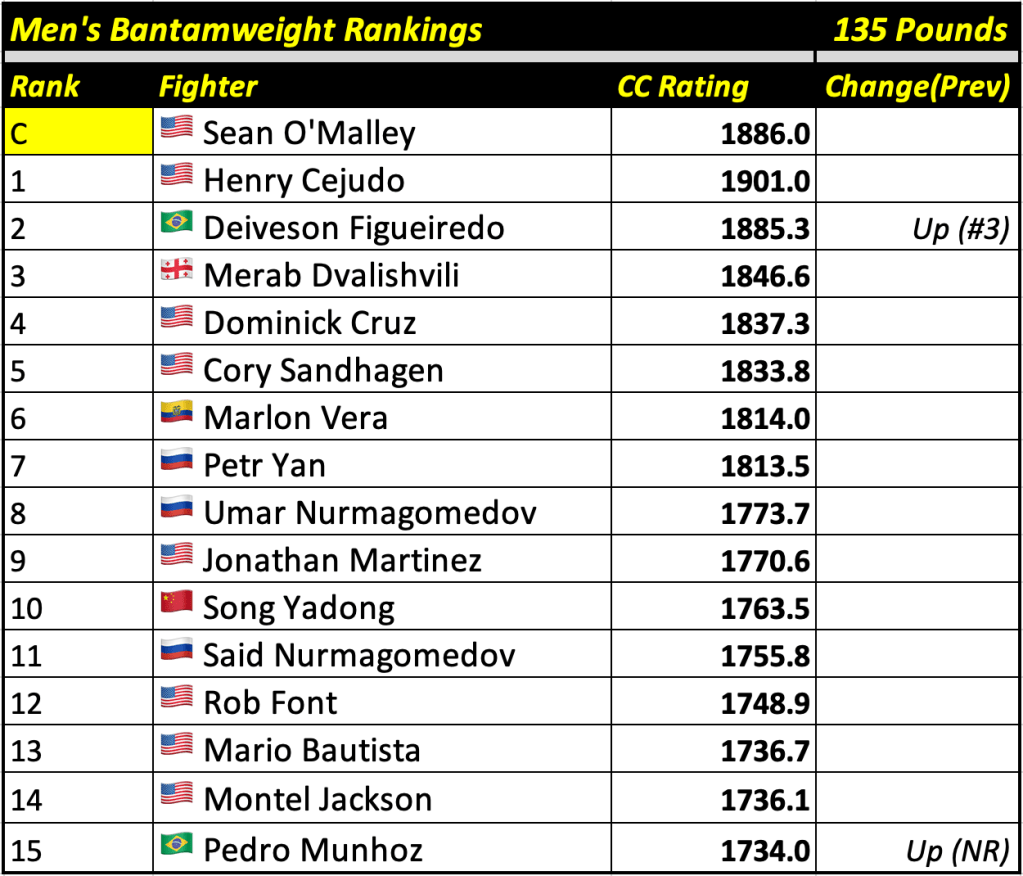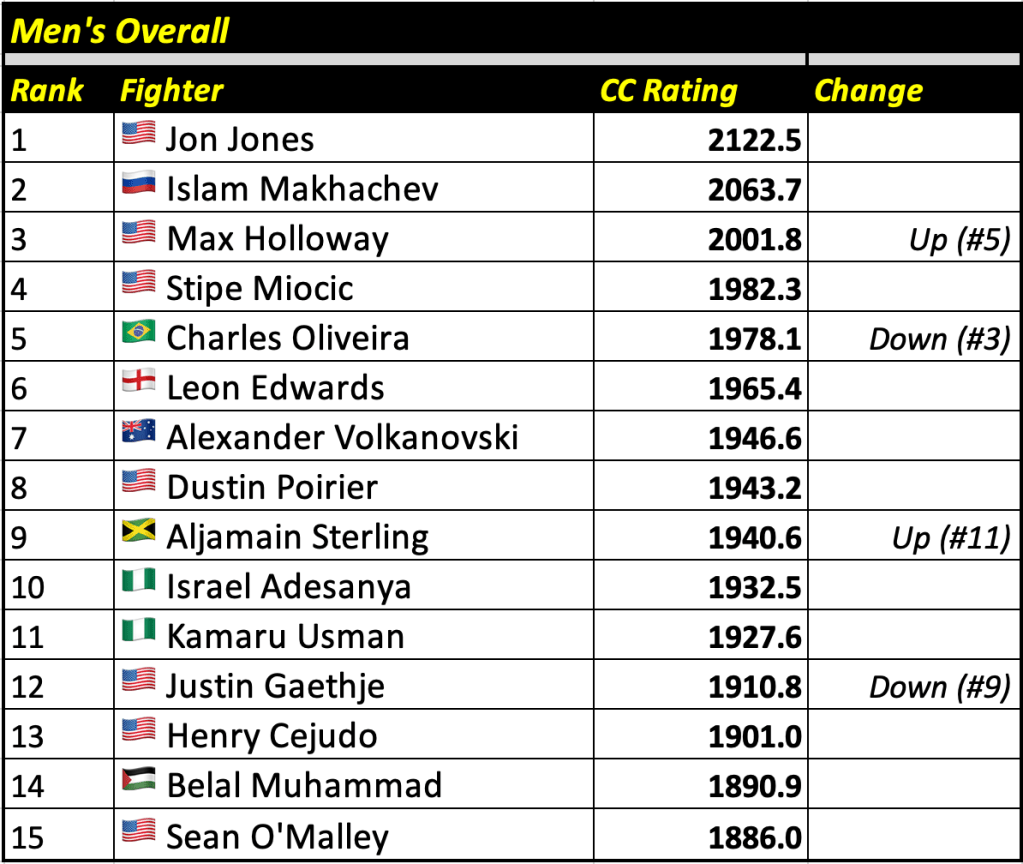These rankings will also rank the top 15 male and female fighters overall. Note, we do not call them “pound-for-pound” rankings as most do, as the CC Rating is a metric of dominance and performance as opposed to talent relative to size. So, they will simply be called “Overall Male” and “Overall Female” rankings.