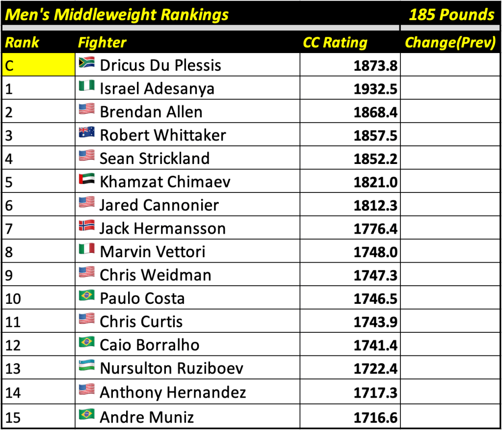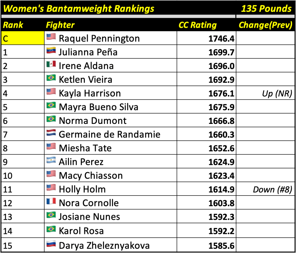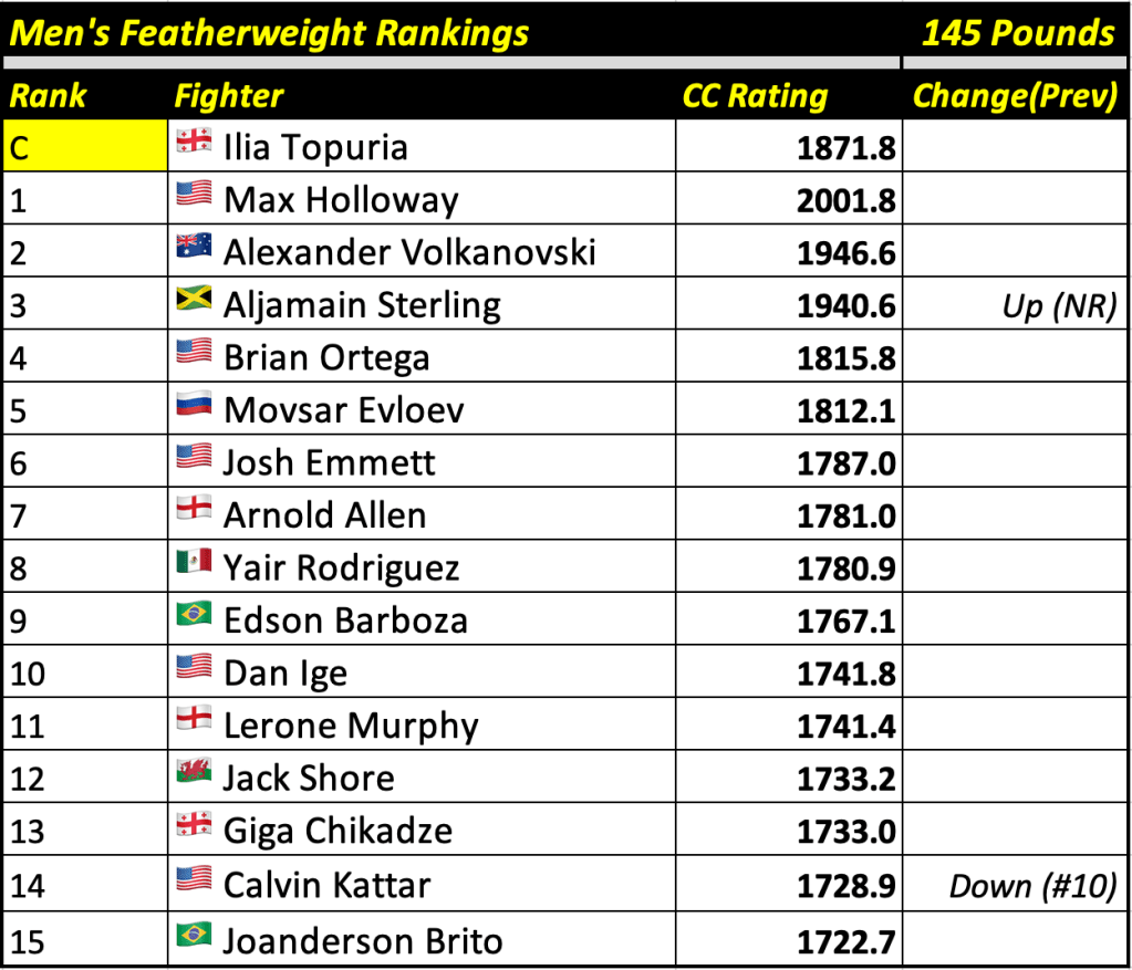 These rankings will also rank the top 15 male and female fighters overall. Note, we do not call them “pound-for-pound” rankings as most do, as the CC Rating is a metric of dominance and performance as opposed to talent relative to size. So, they will simply be called “Overall Male” and “Overall Female” rankings.