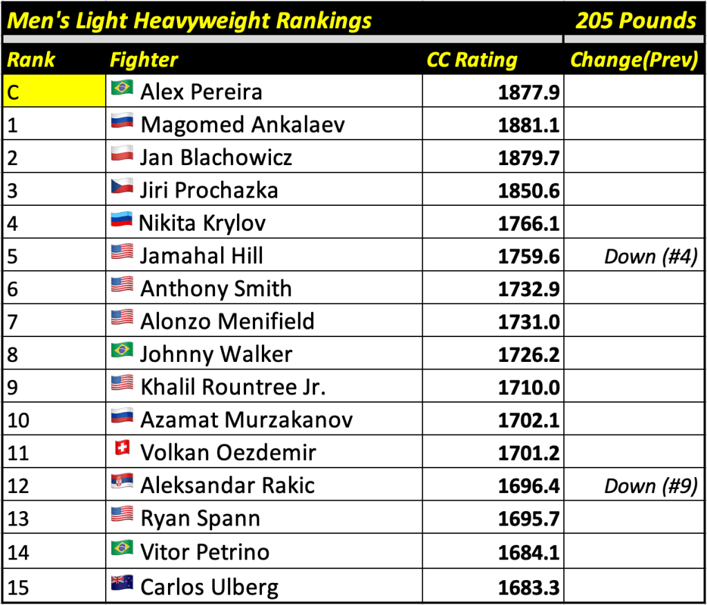 After every UFC fight card, Cage Calculus will publish up-to-date rankings based on our forecast algorithm. The rankings will display the champion and the top 15 contenders in each weight division, alongside their CC Rating (the champion will always be displayed at the top regardless of whether or not they are the highest rated fighter in their division).