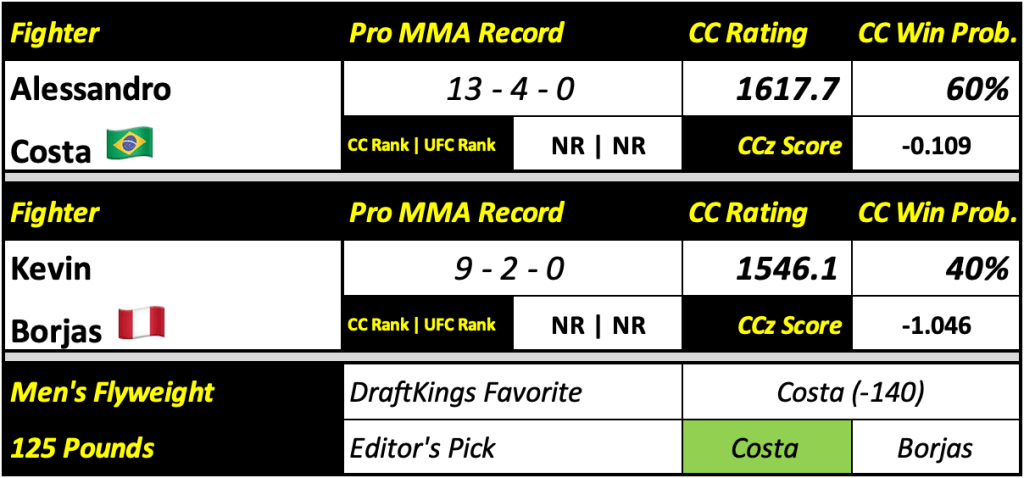 Costa is one of a select few flyweights who has enough power in his hands to end a fight instantly. People like to point to his 1-2 record in the UFC as proof that he’s not polished enough. However, his two losses have come to this card’s title challenger Steve Erceg and top-3 contender Amir Albazi. Costa might not be a ranked flyweight yet, but he is a powerful striker who has the added bonus of being a jiu-jitsu black belt. Borjas has a cardio advantage and is a little lengthier, but that’s about it. Trust the algorithm and the oddsmakers.