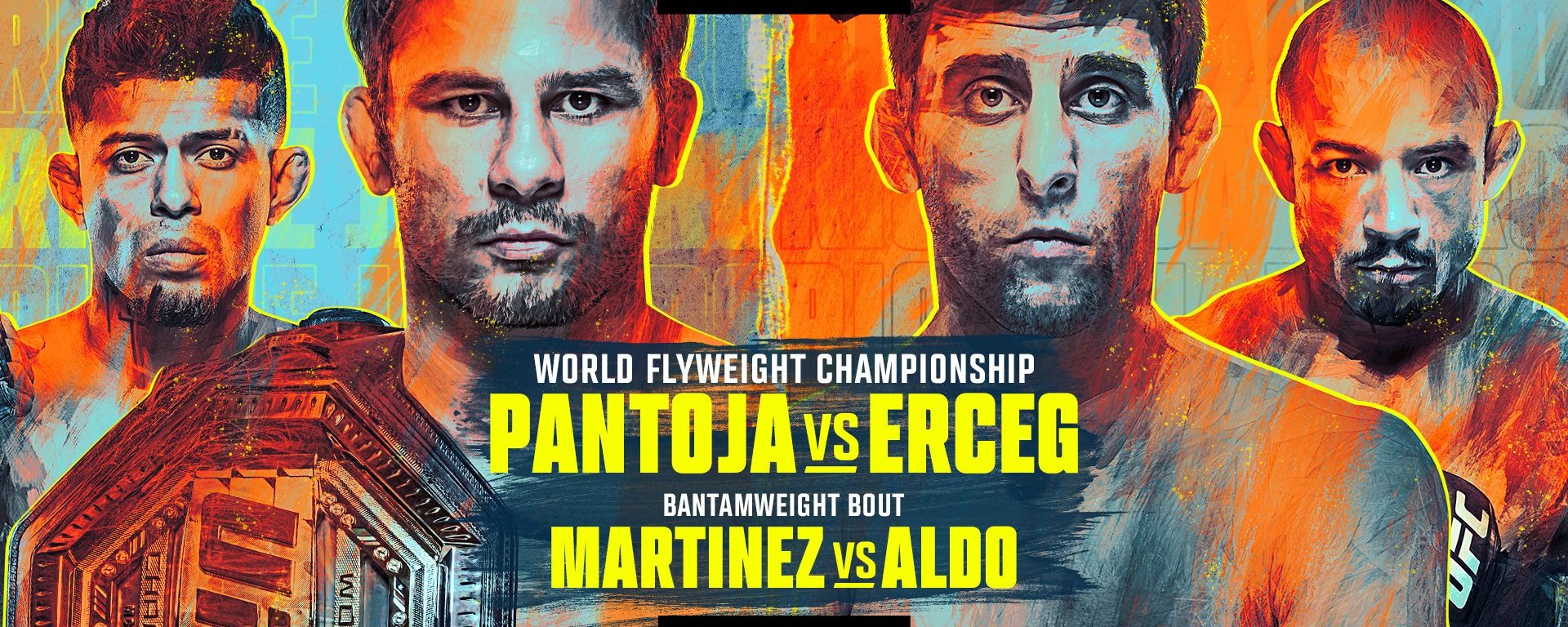 The main card will be headlined by a bout for the men’s flyweight championship. Champion Alexandre Pantoja (pictured middle left) will face tenth ranked contender Steve Erceg (pictured middle right). In the co-main event, longtime men’s featherweight champion Jose Aldo (pictured far right) returns from retirement to face bantamweight contender Jonathan Martinez (pictured far left).