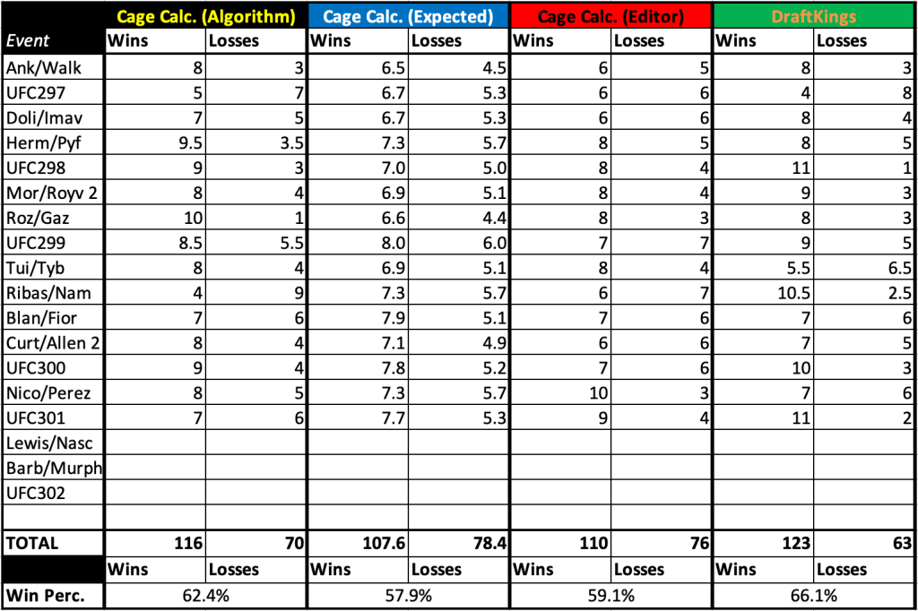 After every event, check back in to see how our algorithm and our editor’s picks stack up against the DraftKings Sportsbook. You can also see how many wins the algorithm expects, given the probabilities it generates (for example, if the algorithm gives ten fighters a 60 percent chance of winning, it would only expect six of them to win with those odds). How close the algorithm is to its expected numbers gives a better picture of its accuracy. You can read more about this in our methodology page.