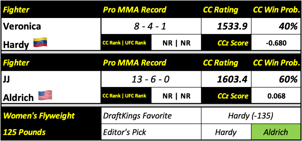 Someone’s about to lose their two-fight win streak. Both women are pretty well-rounded fighters. Ultimately, Aldrich’s experience and strength of schedule should give her the edge. Hardy won’t be able to bring anything she hasn’t seen before. This will be a close bout and will surely be Hardy’s toughest test since returning from a three-year layoff last year. However, Aldrich has been consistent and active, fighting and beating some tough opponents. Octagon experience against the likes of Erin Blanchfield won’t hurt either.