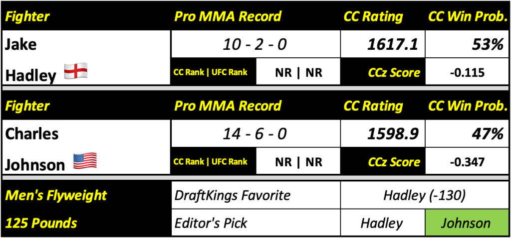 Johnson has a new lease on life after breaking his three-fight losing streak by upsetting undefeated Kazakh prospect Azat Maksum in February. Hadley, on the other hand, is coming off of an upset loss to Cody Durden, where he was a two-to-one favorite. Hadley will be the more aggressive fighter and often relies on a finish. Johnson has a better ground game and has shown an ability to tough out a decision if he has to. This is another one with upside for the underdog.