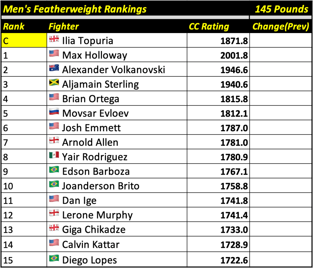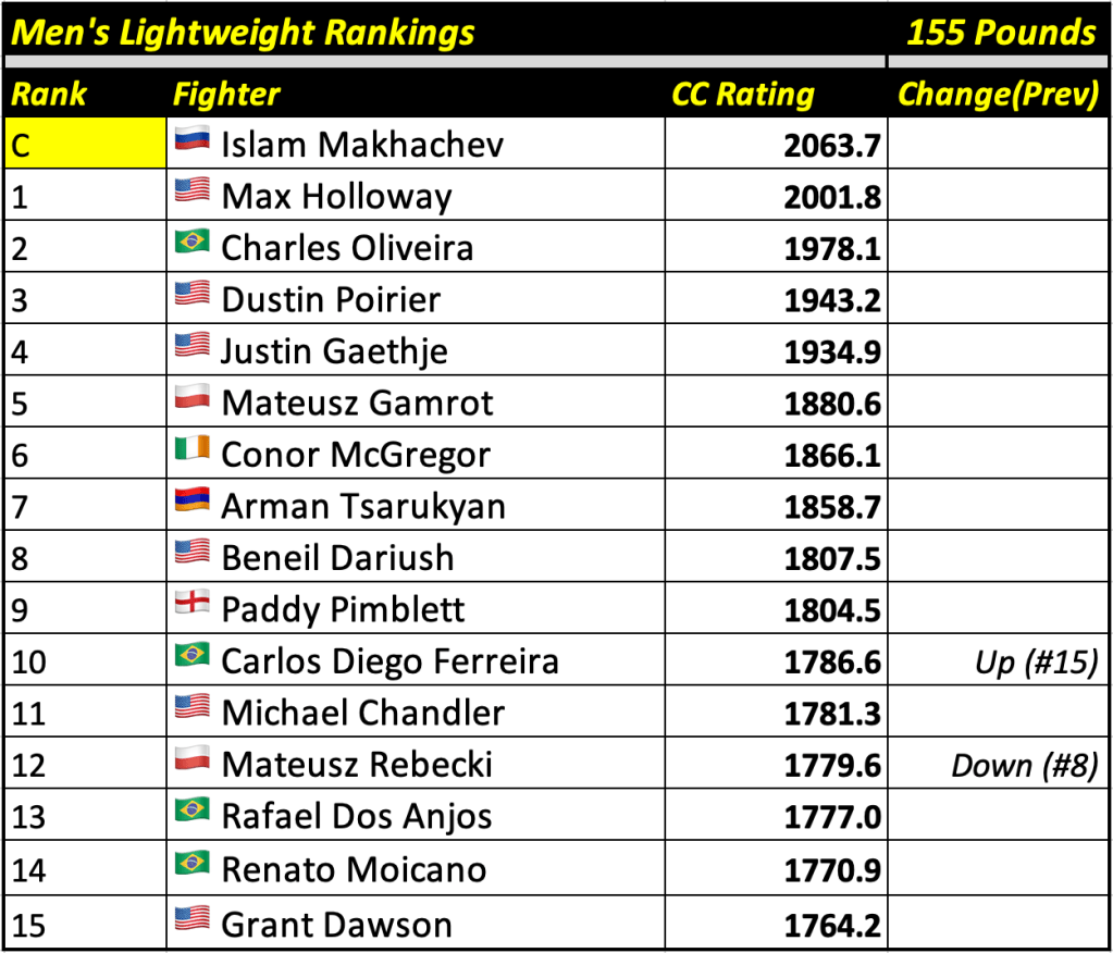 After every UFC fight card, Cage Calculus will publish up-to-date rankings based on our forecast algorithm. The rankings will display the champion and the top 15 contenders in each weight division, alongside their CC Rating (the champion will always be displayed at the top regardless of whether or not they are the highest rated fighter in their division).