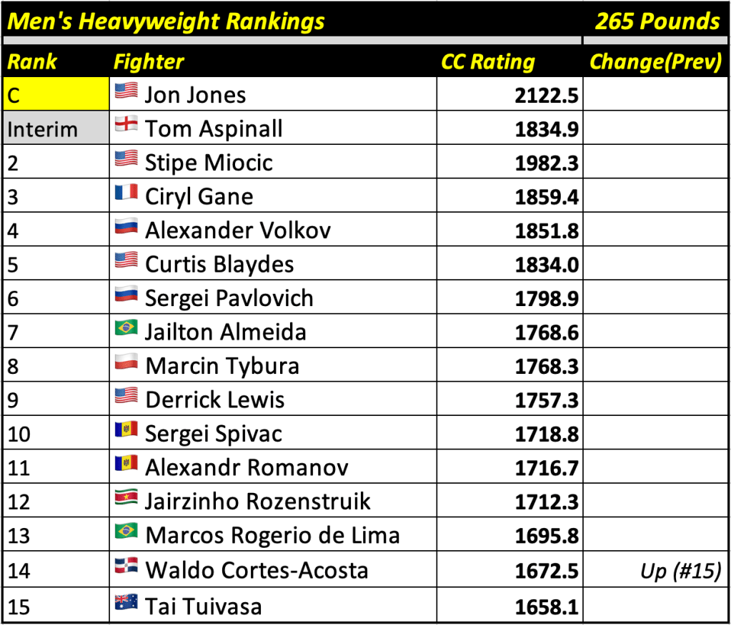 These rankings will also rank the top 15 male and female fighters overall. Note, we do not call them “pound-for-pound” rankings as most do, as the CC Rating is a metric of dominance and performance as opposed to talent relative to size. So, they will simply be called “Overall Male” and “Overall Female” rankings.
