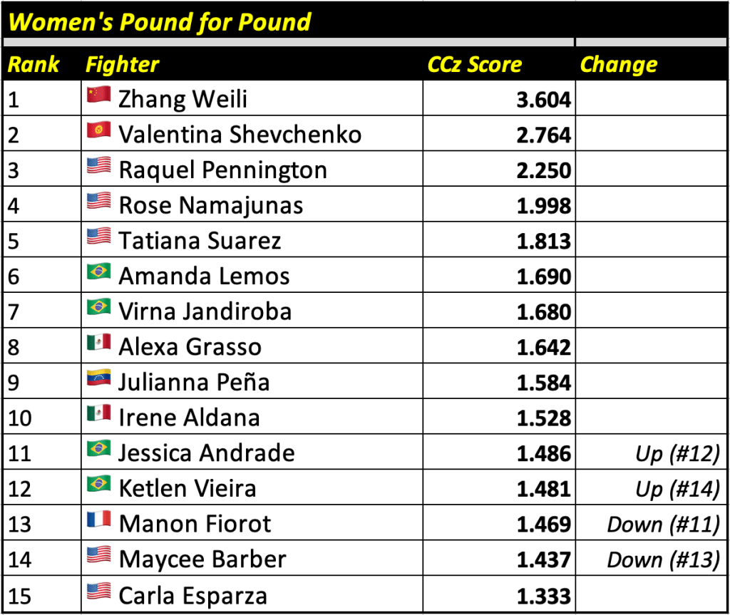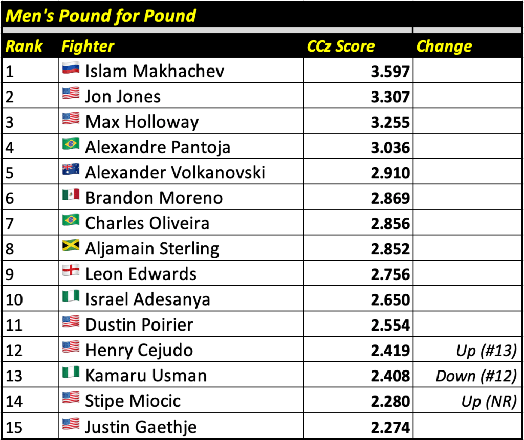 The Cage Calculus Pound for Pound Rankings is based on a fighter’s CCz Score. The CCz Score is a score that shows how much better a given fighter is than the average fighter in their respective weight class.