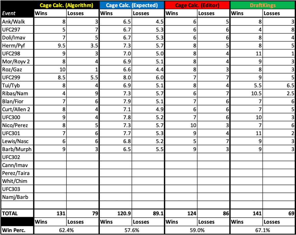 After every event, check back in to see how our algorithm and our editor’s picks stack up against the DraftKings Sportsbook. You can also see how many wins the algorithm expects, given the probabilities it generates (for example, if the algorithm gives ten fighters a 60 percent chance of winning, it would only expect six of them to win with those odds). How close the algorithm is to its expected numbers gives a better picture of its accuracy. You can read more about this in our methodology page.