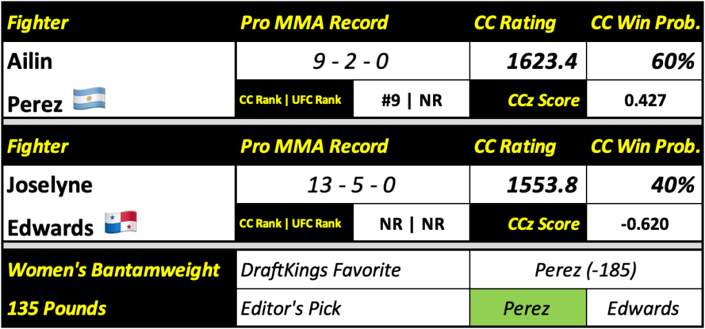 This is a tale of strengths and weaknesses. Perez is a highly-skilled, dominant wrestler/grappler. Edwards is a great, rangy striker. The difference is that Edwards has shown she’s vulnerable to being taken down and is usually unable to do anything about it once she’s there. That should be all the opening Perez needs to seal this win for herself and come closer to being a bona fide contender at 135 pounds.
