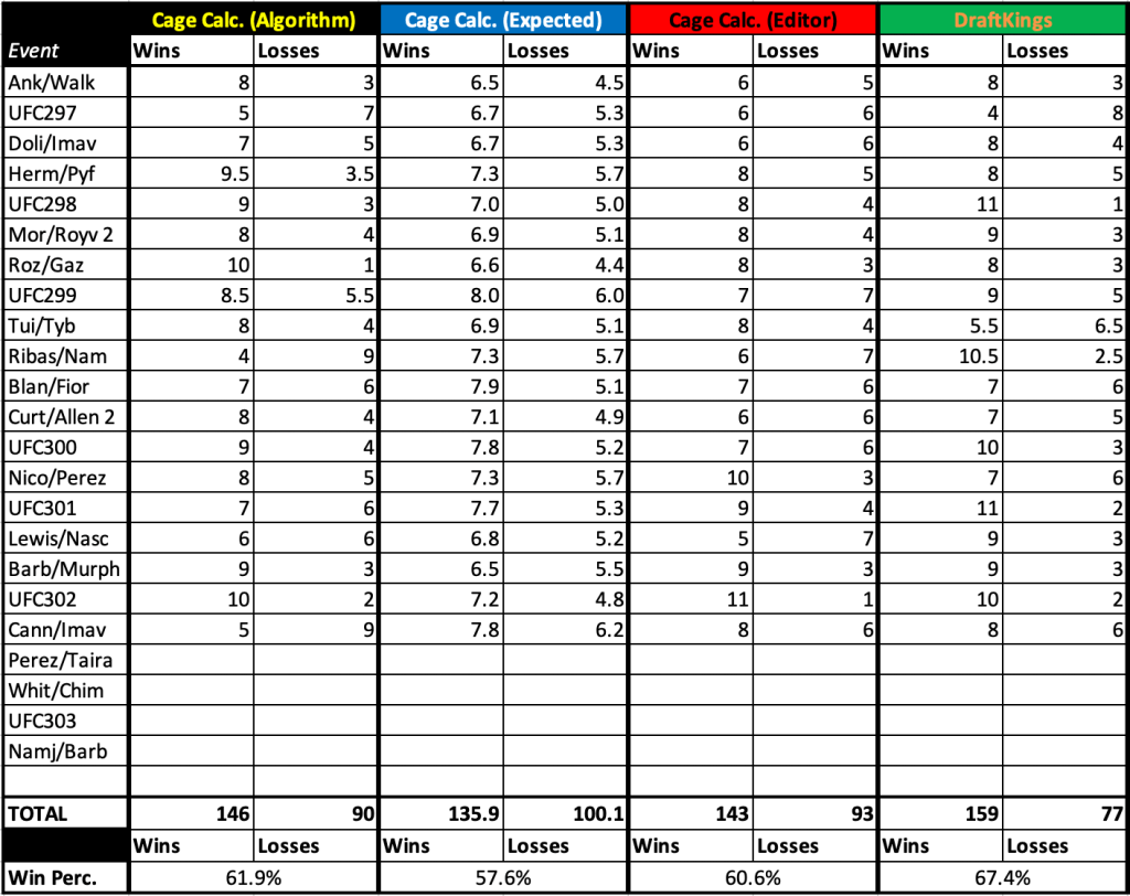 After every event, check back in to see how our algorithm and our editor’s picks stack up against the DraftKings Sportsbook. You can also see how many wins the algorithm expects, given the probabilities it generates (for example, if the algorithm gives ten fighters a 60 percent chance of winning, it would only expect six of them to win with those odds). How close the algorithm is to its expected numbers gives a better picture of its accuracy. You can read more about this in our methodology page.