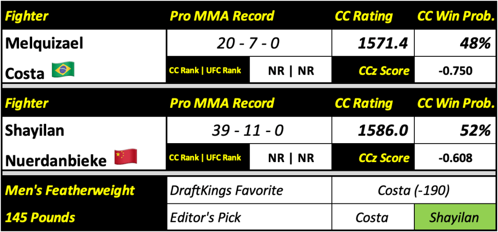 Costa is a stunningly quick striker. His 1-2 UFC record doesn’t tell the whole story. His a versatile, talented fighter who has become a watched prospect in the UFC for a reason. However, he has trouble once the fight gets to the ground. This is something Nuerdanbieke has a wealth of experience with, given his 50 pro fights at just the age of 30. Costa may have more talent on paper, but Nuerdanbieke is strong where he needs to be to match up well against the Brazilian.