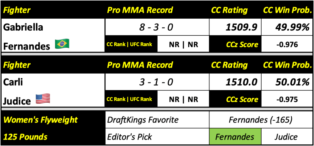 Fernandes is still looking for her first UFC win after two tries. After two straight submission wins made her the LFA interim flyweight champ, she’s dropped two decisions since moving to the UFC. Judice is a rare entity in this division, a legitimate power puncher. All three of her pro wins are first round KOs. However, Fernandes has never been finished. She should be able to use her submission ability to get things to the ground and tire out Judice. Judice should either swing for the fences early or try to stay careful at distance to avoid the clinch or the takedown. Neither path looks entirely promising.