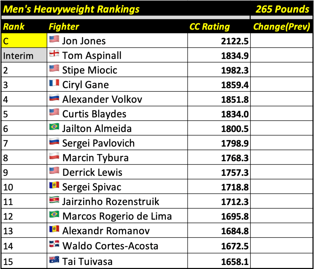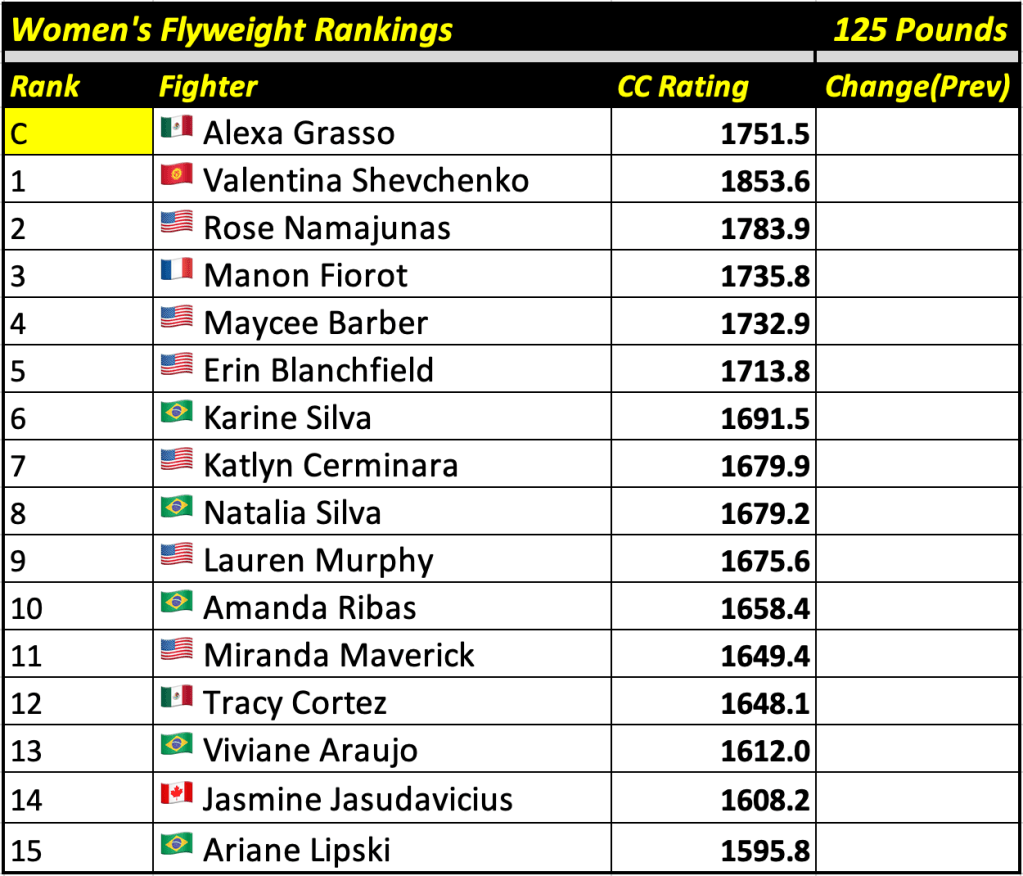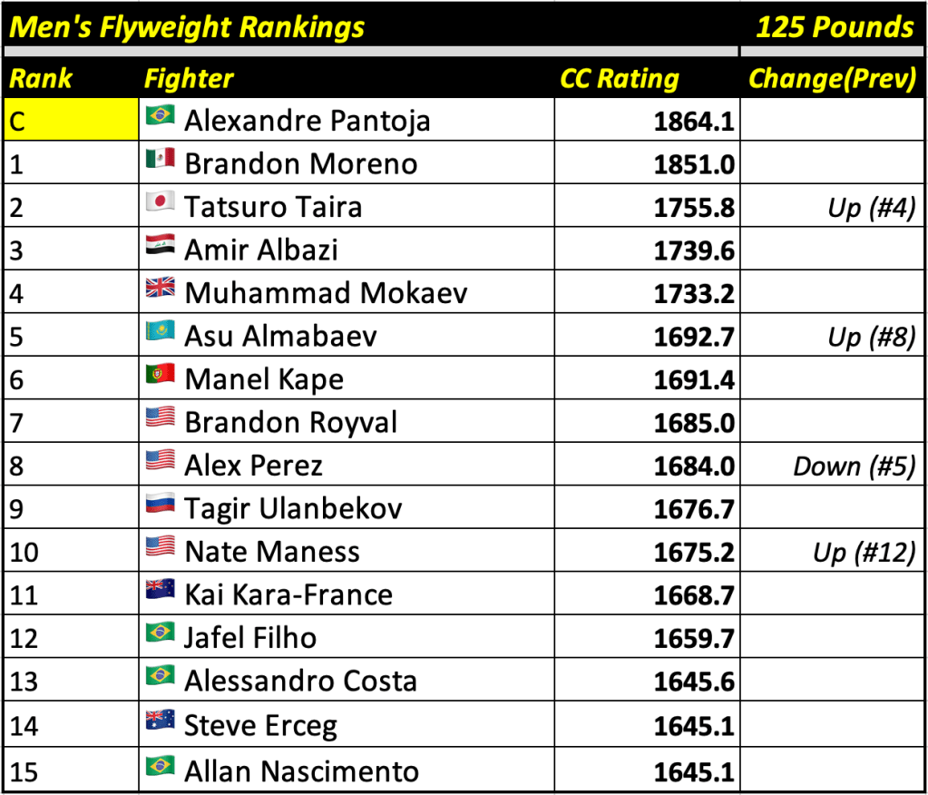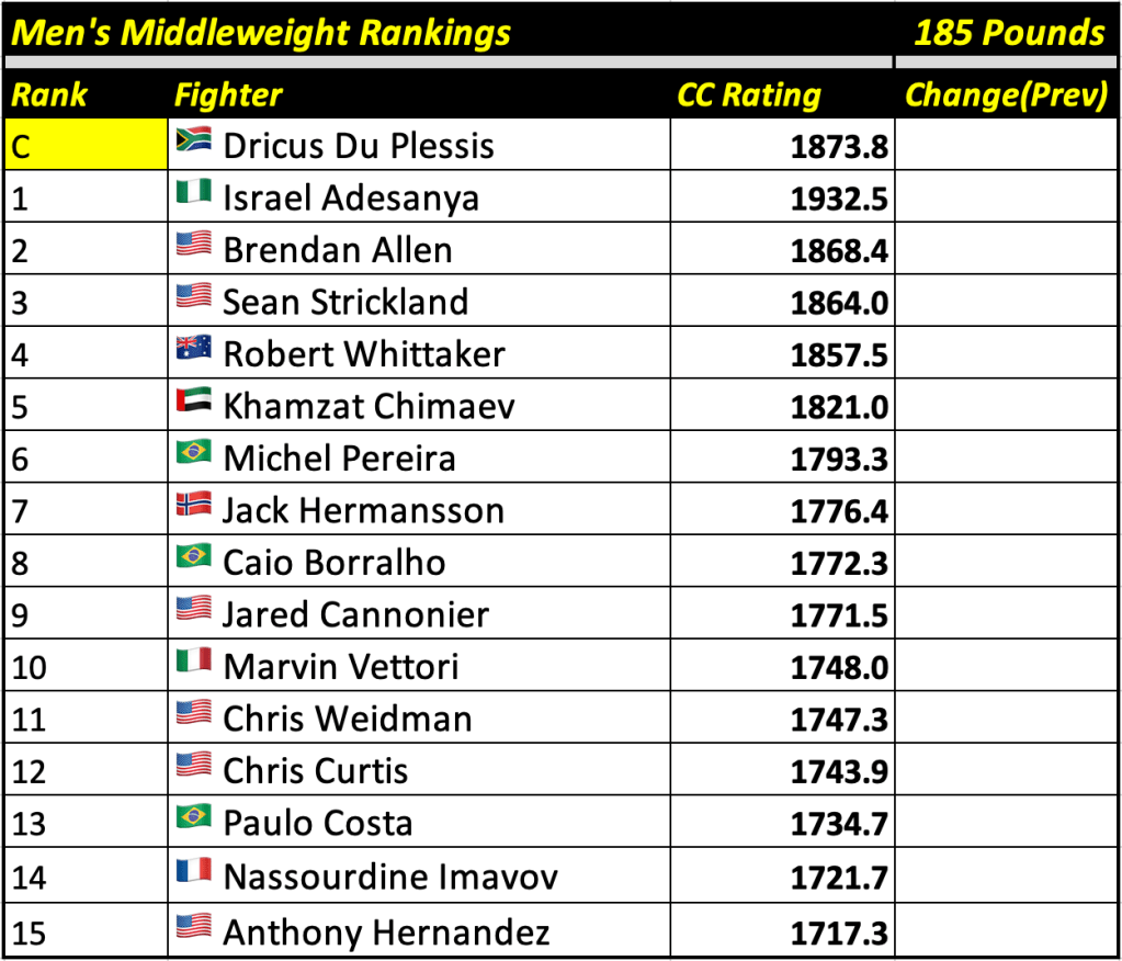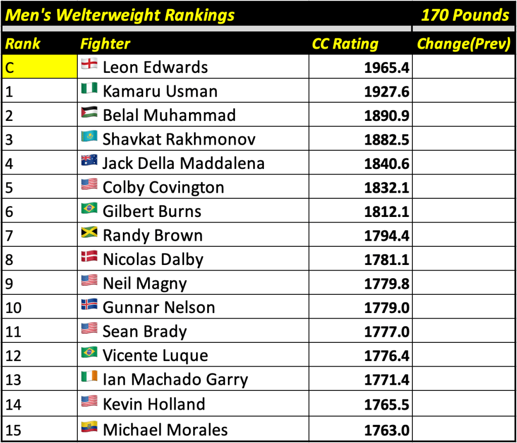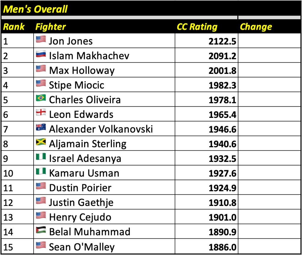 These rankings will also rank the top 15 male and female fighters overall. Note, we do not call them “pound-for-pound” rankings as most do, as the CC Rating is a metric of dominance and performance as opposed to talent relative to size. So, they will simply be called “Overall Male” and “Overall Female” rankings.