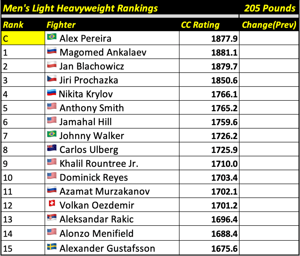 After every UFC fight card, Cage Calculus will publish up-to-date rankings based on our forecast algorithm. The rankings will display the champion and the top 15 contenders in each weight division, alongside their CC Rating (the champion will always be displayed at the top regardless of whether or not they are the highest rated fighter in their division).