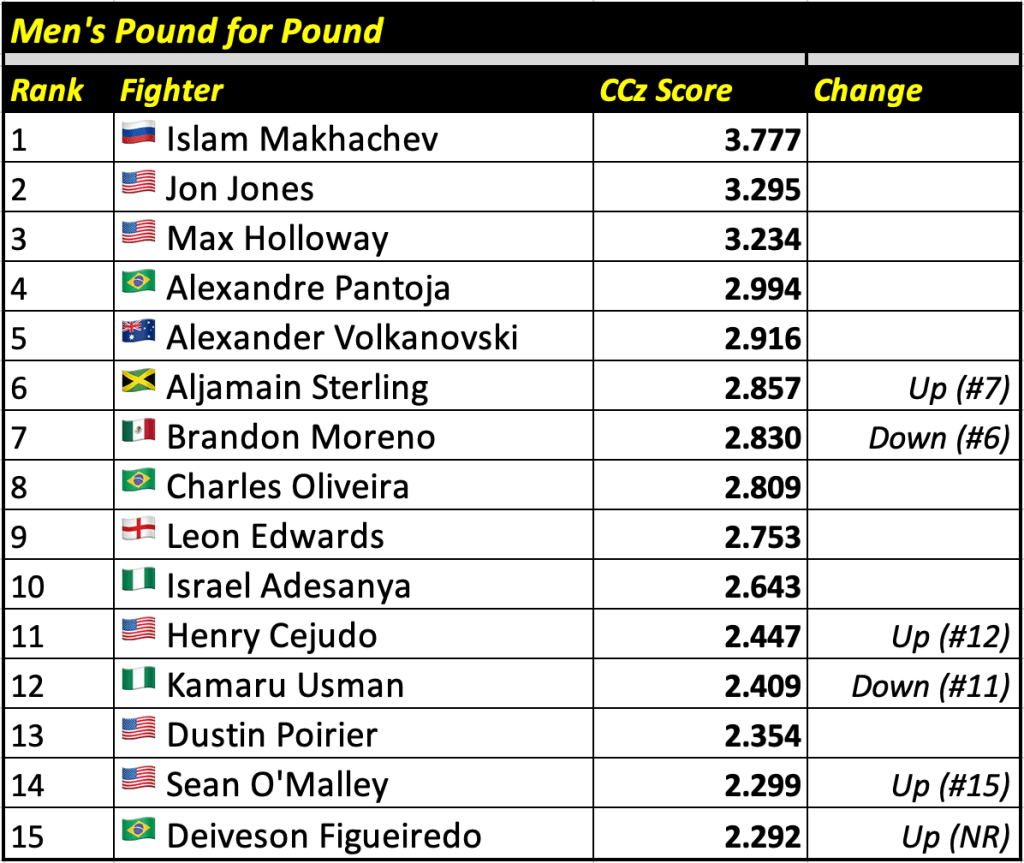 The Cage Calculus Pound for Pound Rankings is based on a fighter’s CCz Score. The CCz Score is a score that shows how much better a given fighter is than the average fighter in their respective weight class.