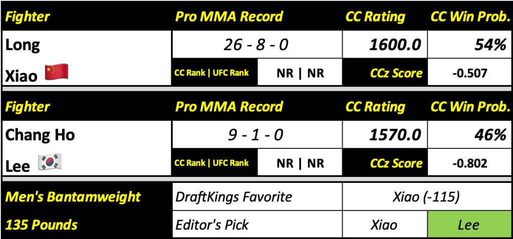 After watching each of these fighters’ paths to this bout, it’s puzzling why Xiao is the favorite (even if it is a slim margin). Lee managed to finish both of his opponents via ground and pound en route to this finals appearance on Road to the UFC. Meanwhile, Xiao won by a split decision in the quarterfinals and majority decision in the semis. Lee has a higher career finish percentage as well. The only discernible advantage you can see in Xiao is his submission ability. However, Lee is no stranger to submission himself. Going with the Korean to solidify a spot on the UFC roster.