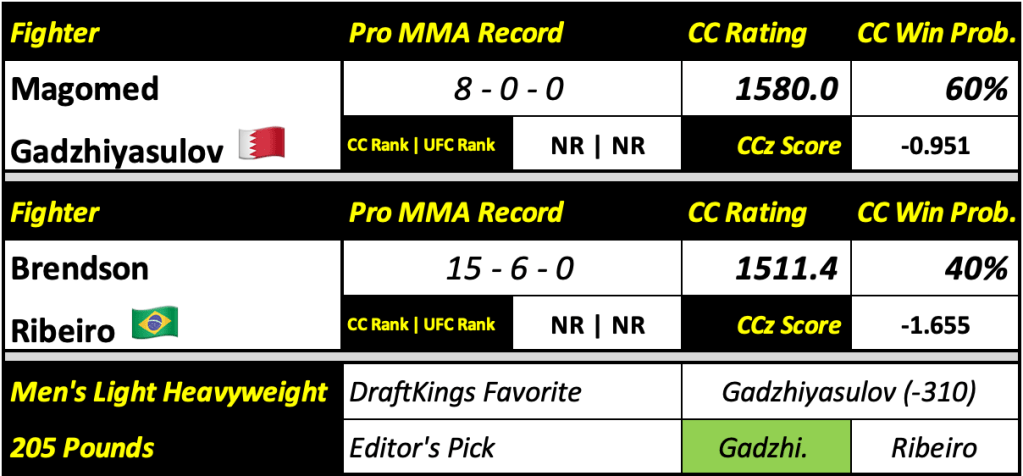 Ribeiro ran into Mingyang Zhang in his UFC debut. Zhang was riding a nine-fight win streak coming into that bout and kept rolling through Ribeiro with a first round KO. Similarly, Gadzhiyasulov is riding a nine-fight win streak coming into this one (he has an 8-0 record, but another win in the Khiza Fight League is not recognized because of issues with the promotion). Gadzhiyasulov, like most Dagestan-born fighters, has a combat sambo background. Yet, most of his wins have come by KO. He’s a versatile fighter now fighting out of Bahrain. He should be an exciting addition to the light heavyweight division, and should get his first win here.
