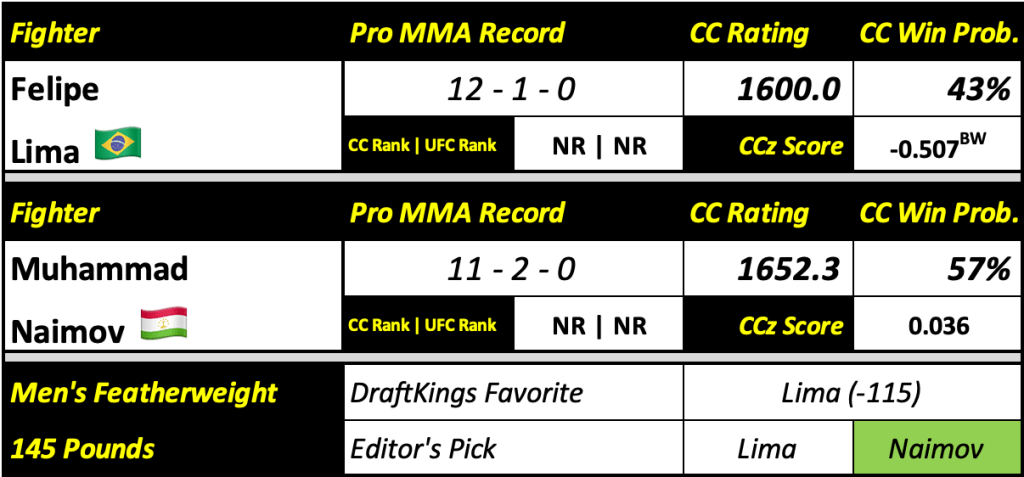 All win probabilities are based off of a fighter’s Cage Calculus (CC) Rating and their place in the CC Rankings. The fighter’s name highlighted in green at the bottom of the panel indicates the editor’s pick to win. Also featured below their record and rating is their divisional rankings in the CC Rankings and the official UFC Rankings. Any fighter falling outside of the top 15 of their respective division is classified as NR (not ranked).