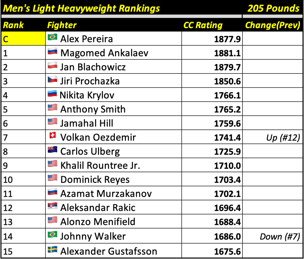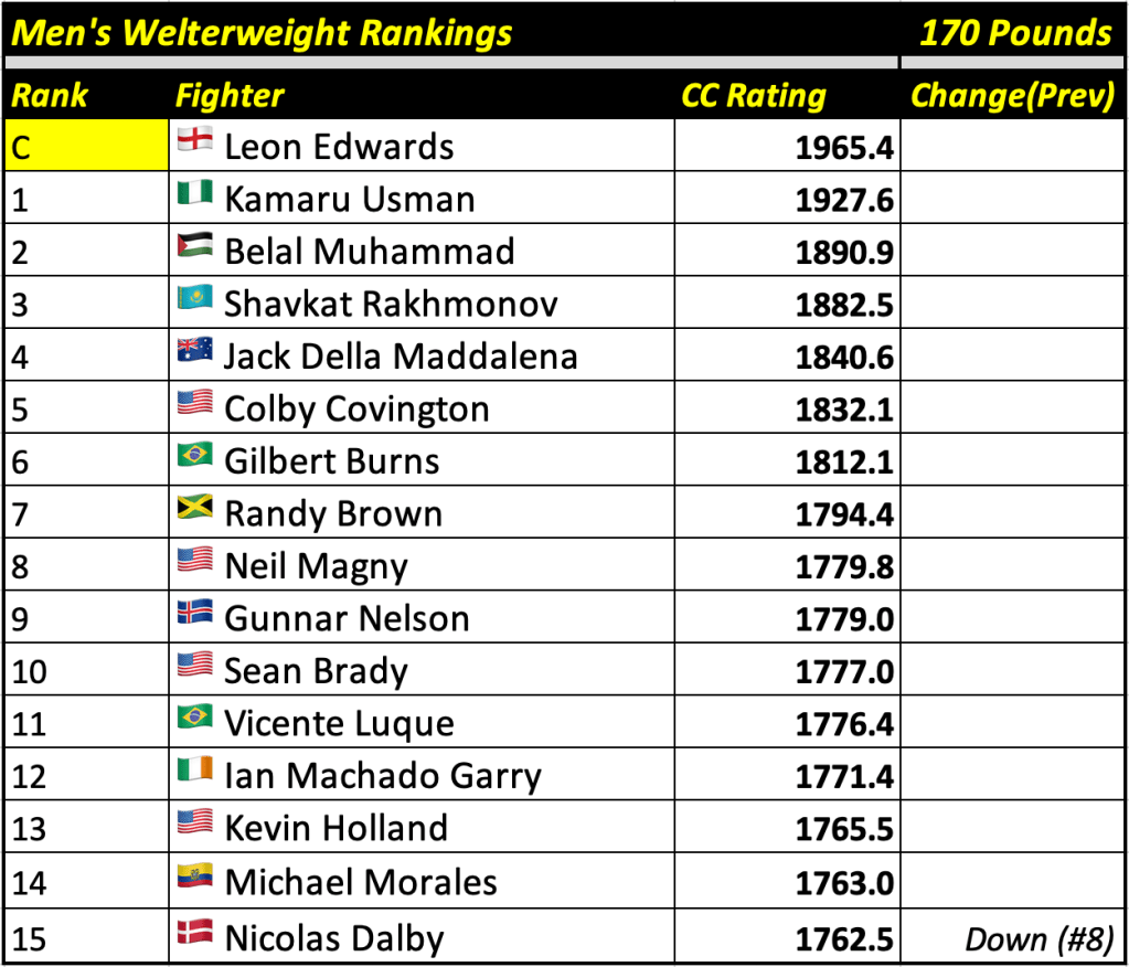 After every UFC fight card, Cage Calculus will publish up-to-date rankings based on our forecast algorithm. The rankings will display the champion and the top 15 contenders in each weight division, alongside their CC Rating (the champion will always be displayed at the top regardless of whether or not they are the highest rated fighter in their division).