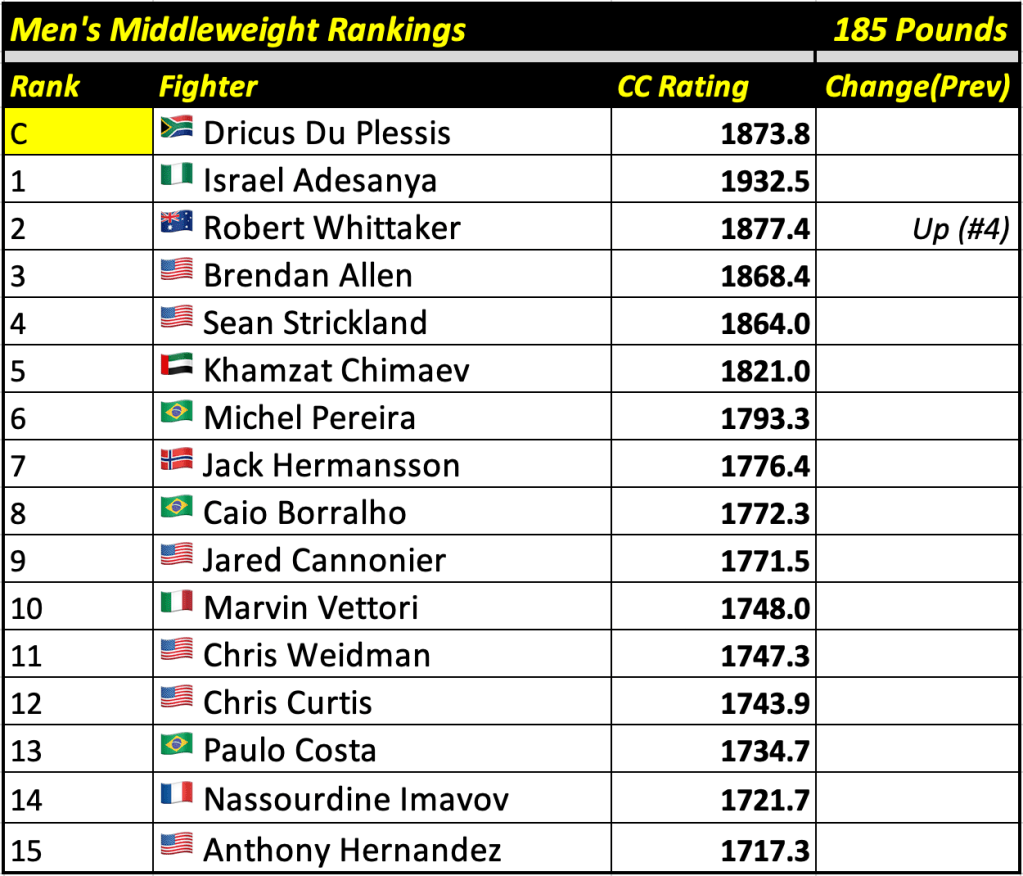 These rankings will also rank the top 15 male and female fighters overall. Note, we do not call them “pound-for-pound” rankings as most do, as the CC Rating is a metric of dominance and performance as opposed to talent relative to size. So, they will simply be called “Overall Male” and “Overall Female” rankings.