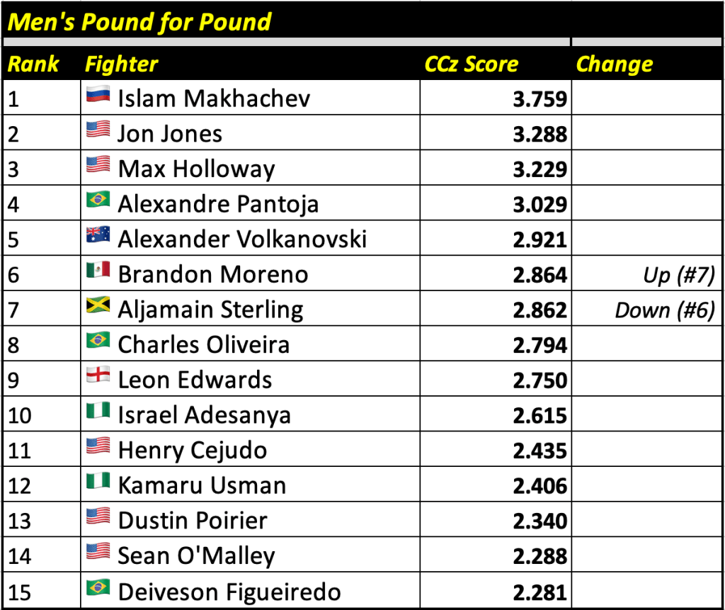The Cage Calculus Pound for Pound Rankings is based on a fighter’s CCz Score. The CCz Score is a score that shows how much better a given fighter is than the average fighter in their respective weight class.