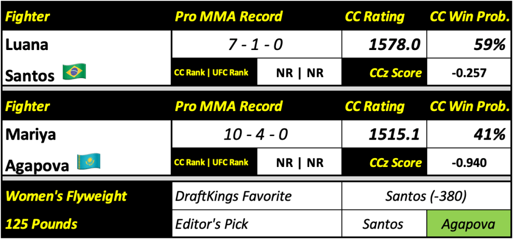 Agapova is going to want this more. She’s not fought in almost two years since her defeat to Gillian Robertson. She has been agitating to get a fight booked and now has one. With an 80 percent finish rate in her career, she has the skills to take this one and re-assert herself in the flyweight division. It’s taken someone in or near the rankings to beat Agapova in the past. Santos hasn’t shown she’s quite there yet. This is a live underdog if there ever was one.
