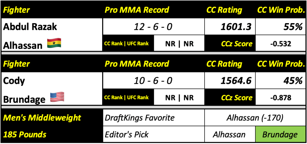 Brundage has homefield advantage, being that he trains in Colorado already. Further, he’s facing a fighter in Alhassan who is pretty well known for gassing himself out. That might be exacerbated in the Denver altitude. If Brundage can avoid the one-punch KO power in round one, he should coast to a decision win or get a submission via his wrestling in the later rounds.