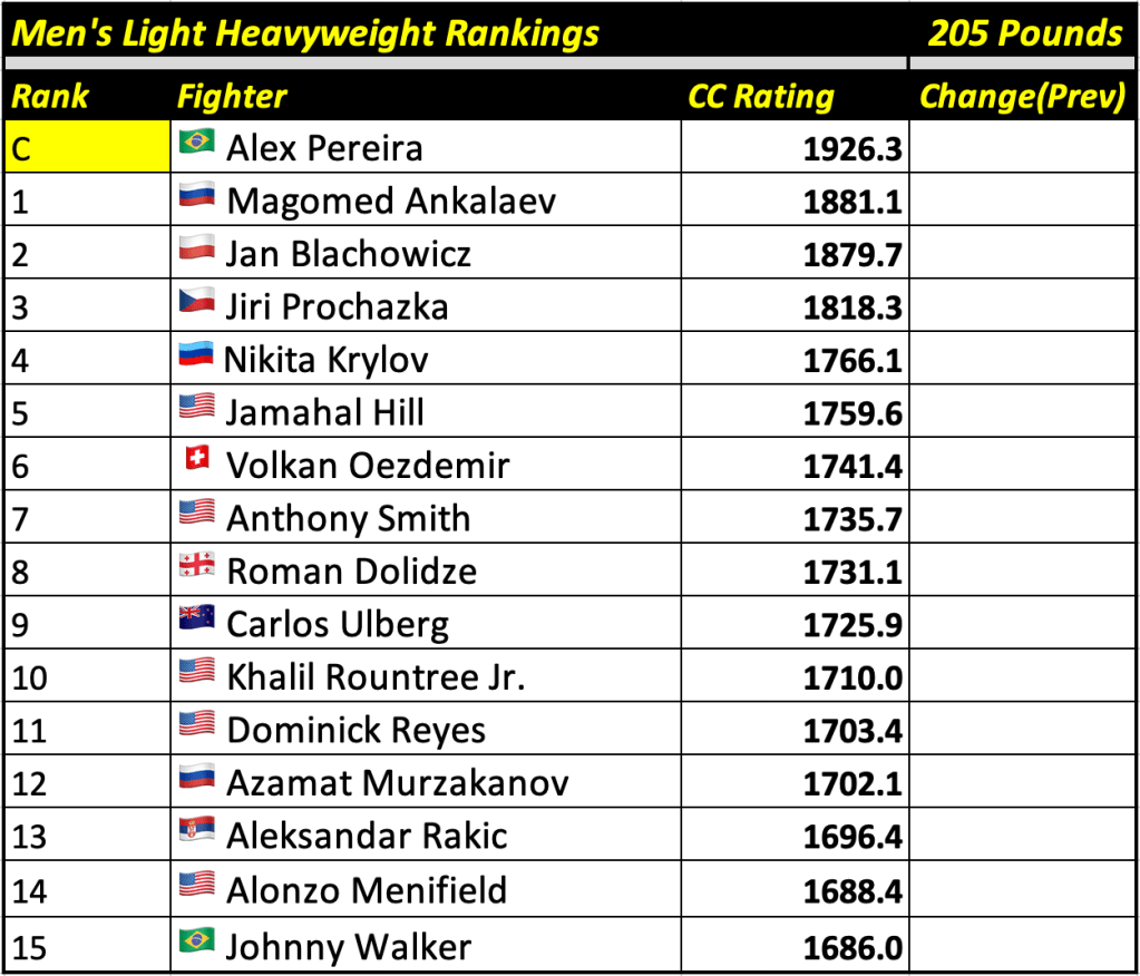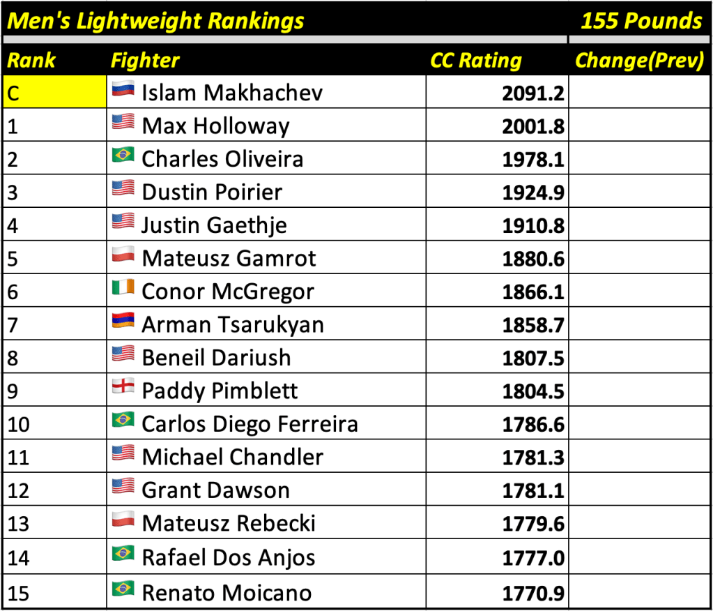 After every UFC fight card, Cage Calculus will publish up-to-date rankings based on our forecast algorithm. The rankings will display the champion and the top 15 contenders in each weight division, alongside their CC Rating (the champion will always be displayed at the top regardless of whether or not they are the highest rated fighter in their division).
